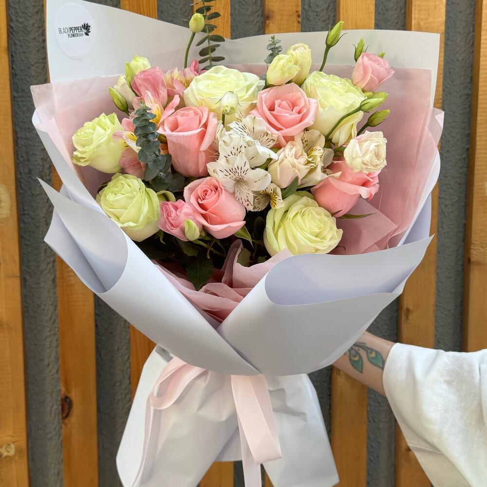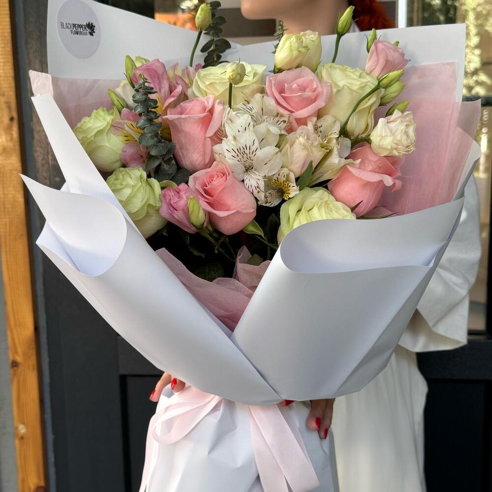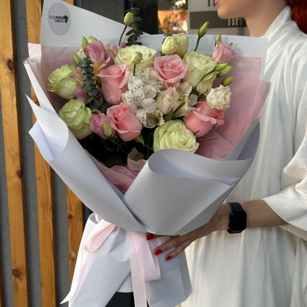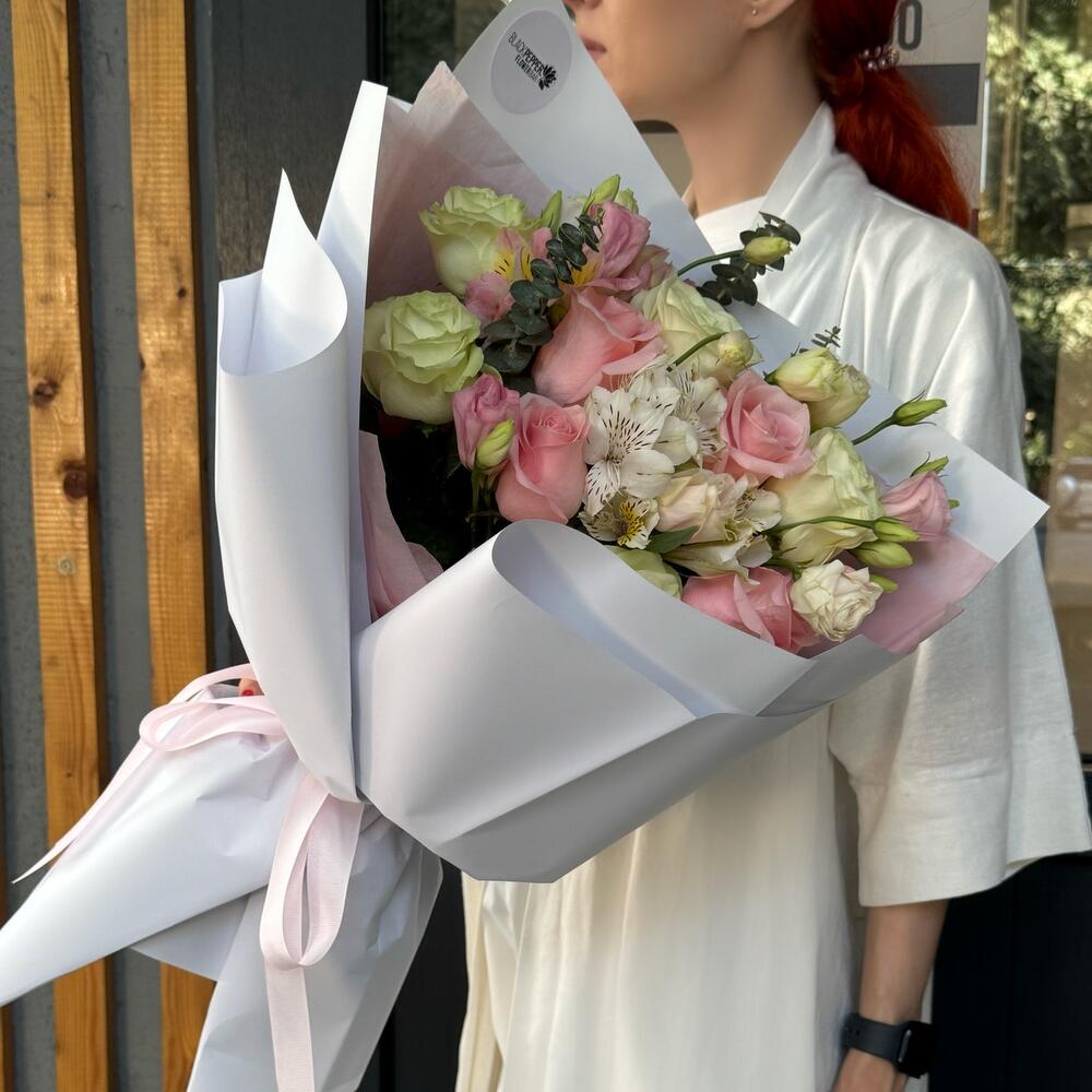 Альстромерия - 2 шт. Эвкалипт - 2 шт. Роза - 9 шт. Эустома - 4 шт.