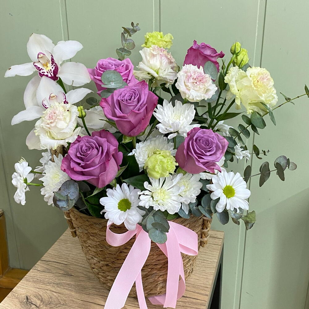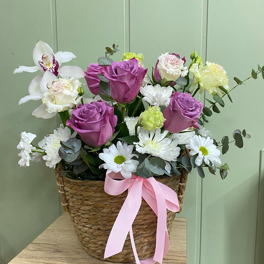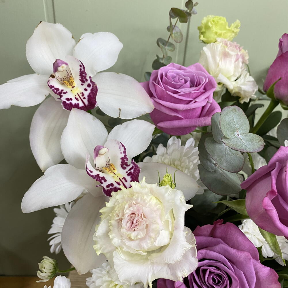 Хризантема кустовая - 2 шт. Эустома - 2 шт. Эвкалипт Микс - 1 шт. Орхидеи Дендробиум - 2 шт. розы - 5 шт.