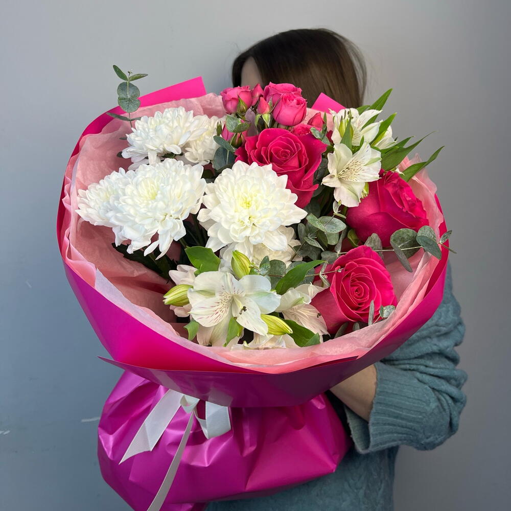 Альстромерия - 2 шт. Хризантема кустовая - 1 шт. Эвкалипт - 1 шт. Роза Эквадор - 3 шт. Спрей роза - 2 шт.