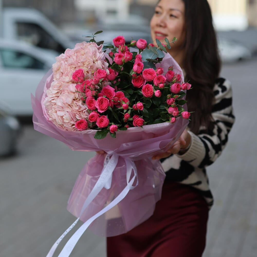 Гортензия - 2 шт. Эвкалипт - 3 шт. Кустовая роза - 5 шт.