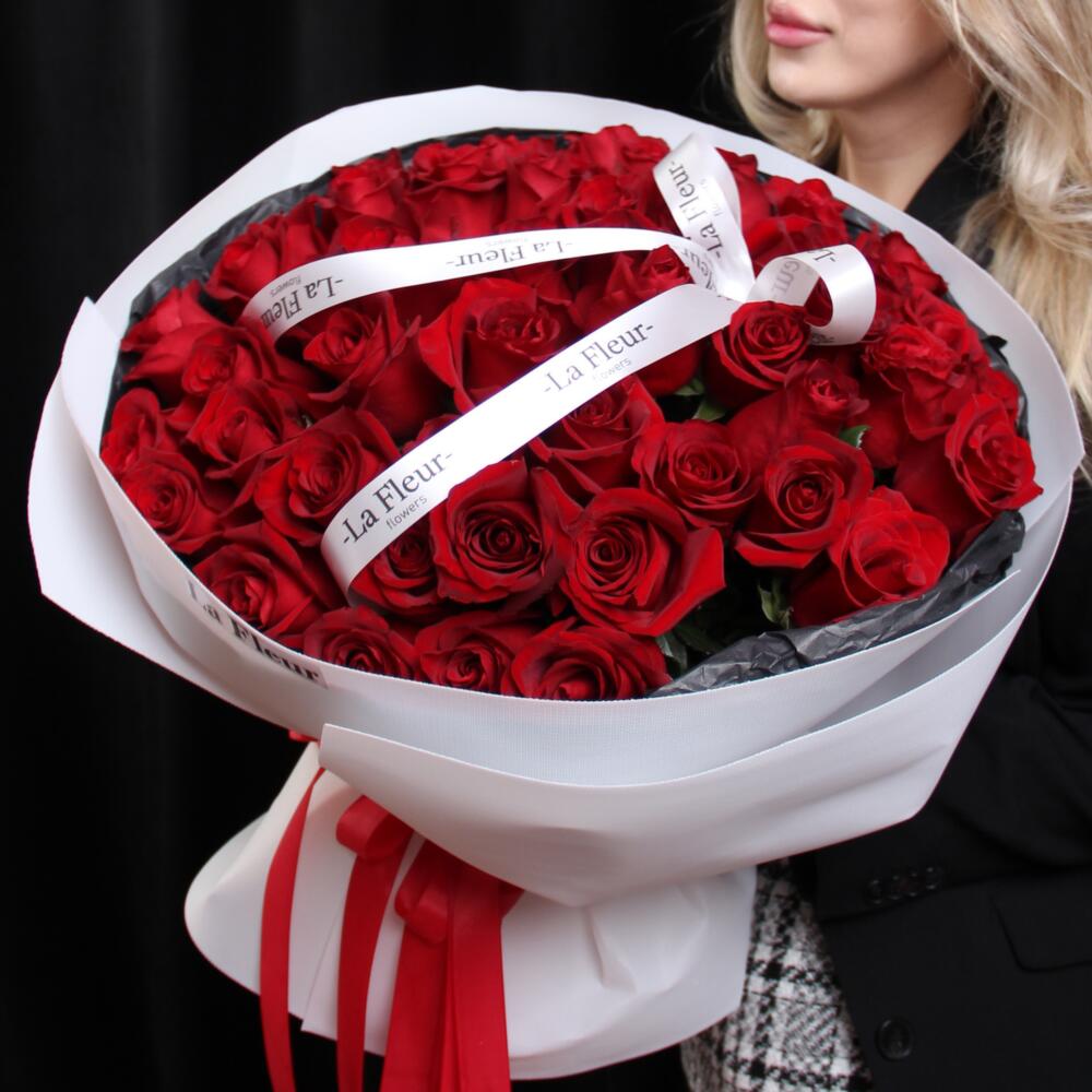 Голландские розы насыщенного алого цвета — символ горячих чувств. Роскошный подарок в стильной белой упаковке для самой важной женщины.