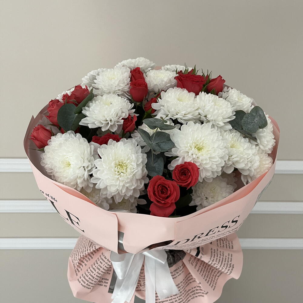 Хризантема кустовая - 4 шт. Кустовая роза - 4 шт. Эвкалипт Микс - 1 шт.