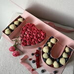 Пионовидная роза - 27 шт. Голубика - 150 гр. Клубника в шоколаде - 13 шт. Клюква - 100 гр.