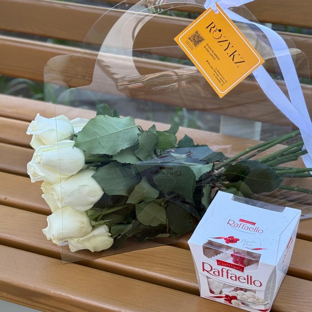 Комбо 15 белых роз в прозрачной сумочке и рафаэло