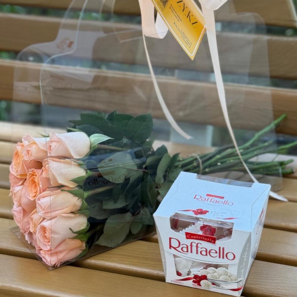 Комбо 15 персиковых роз в прозрачной сумочке и Рафаэло