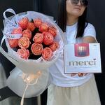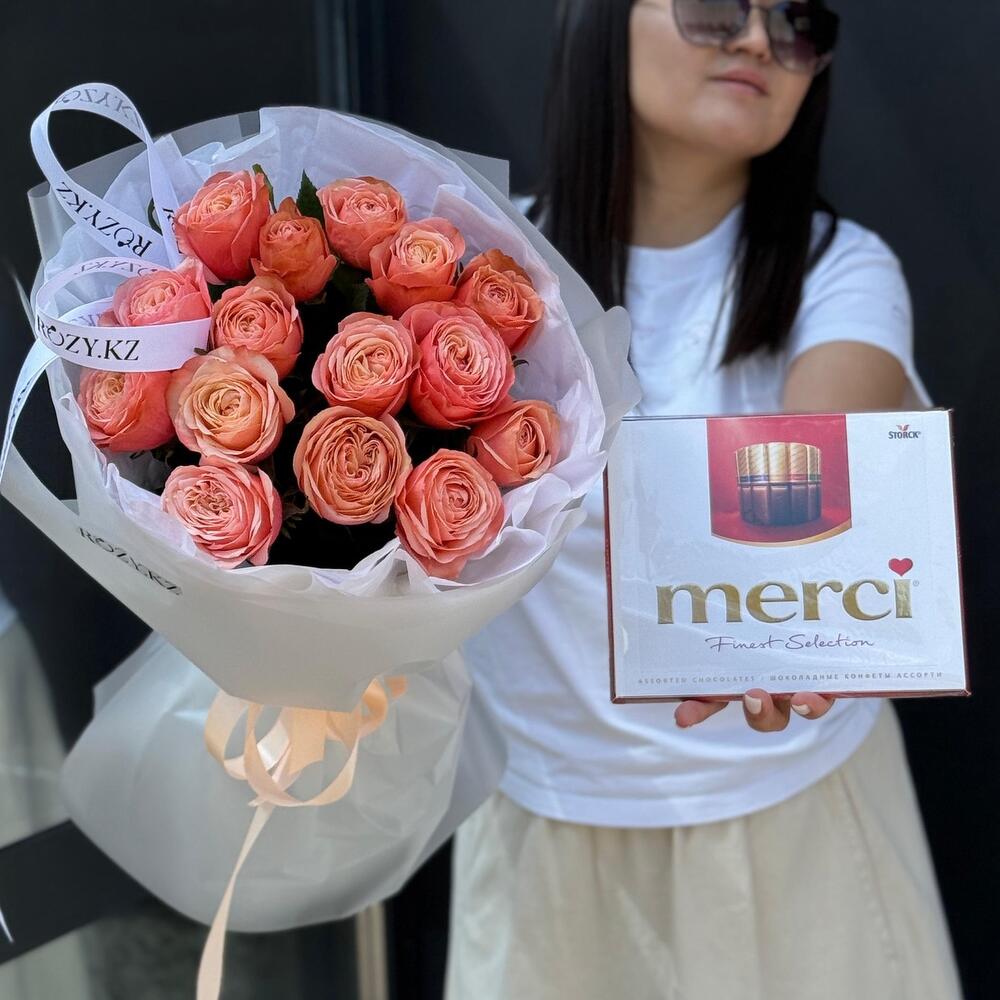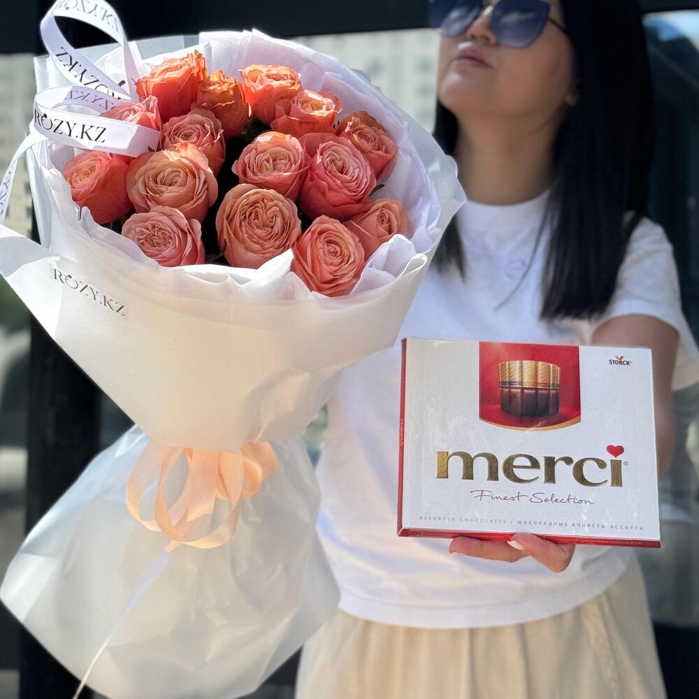 Упаковка дизайнерская - 4 шт. Голландская роза - 15 шт. Мерси шоколад - 250 гр.