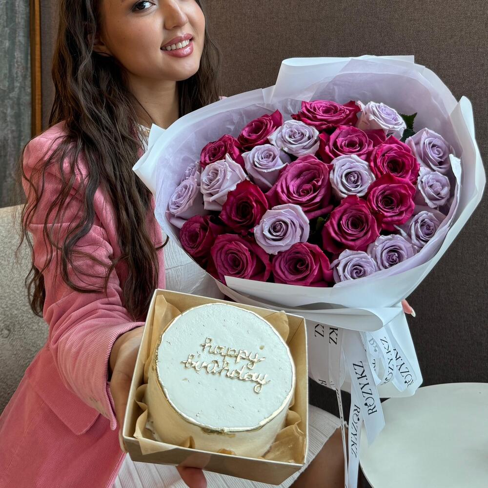 Комбо букет из 25 фиолетовых роз микс и бенто торт Happy Birthday