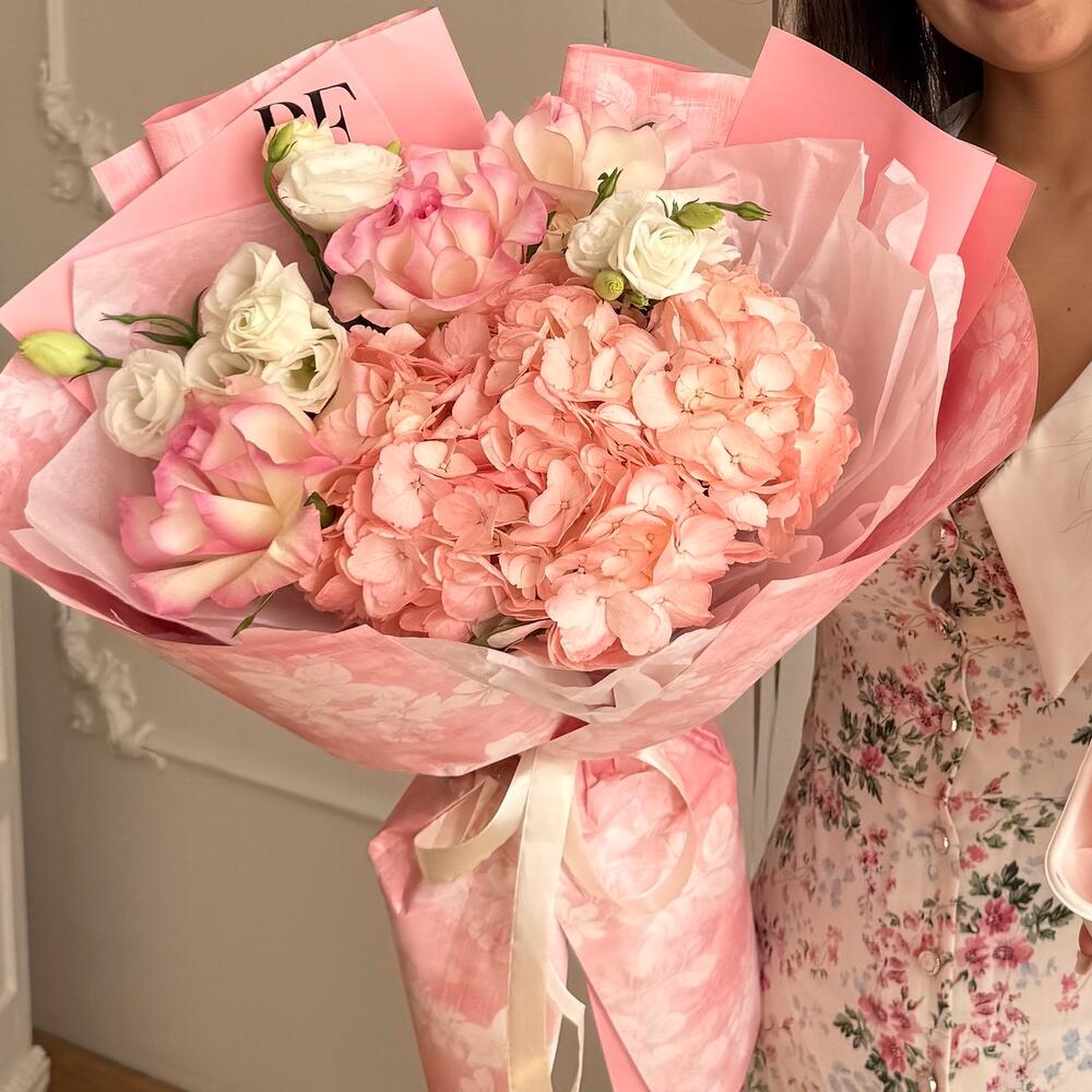 Гортензия - 1 шт. Лизиантус - 2 шт. Шары воздушные (с гелием) - 3 шт. розы - 3 шт. бенто торт - 1 шт.