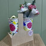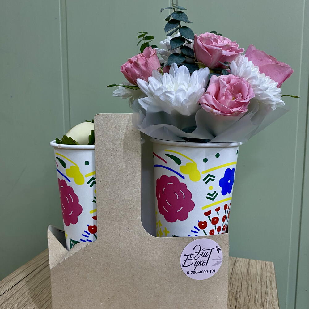 Хризантема кустовая - 1 шт. Кустовая роза - 1 шт. Клубника в шоколаде - 12 шт. переноска для кофе - 1 шт. стаканчик с оазисом - 1 шт. стаканчик кофейный - 1 шт.