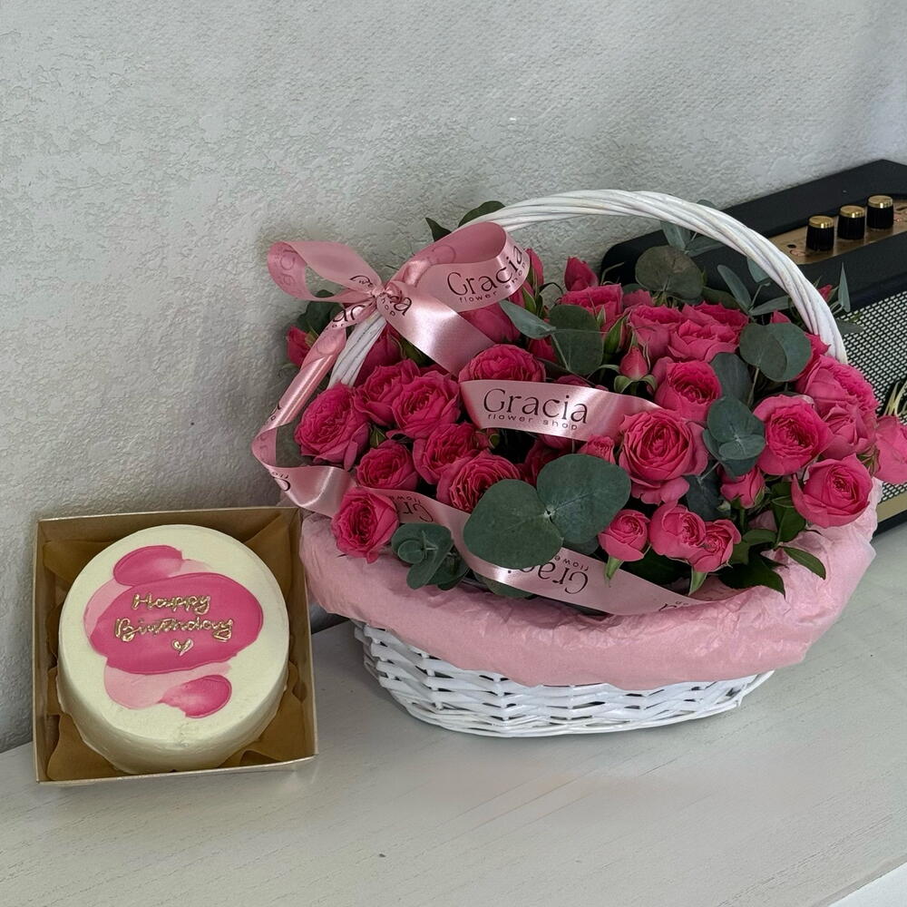 Корзина плетеная - 1 шт. Оазис флористический - 1 шт. Эвкалипт Цинерея - 1 шт. кустовые розы - 5 шт. бенто торт - 1 шт.