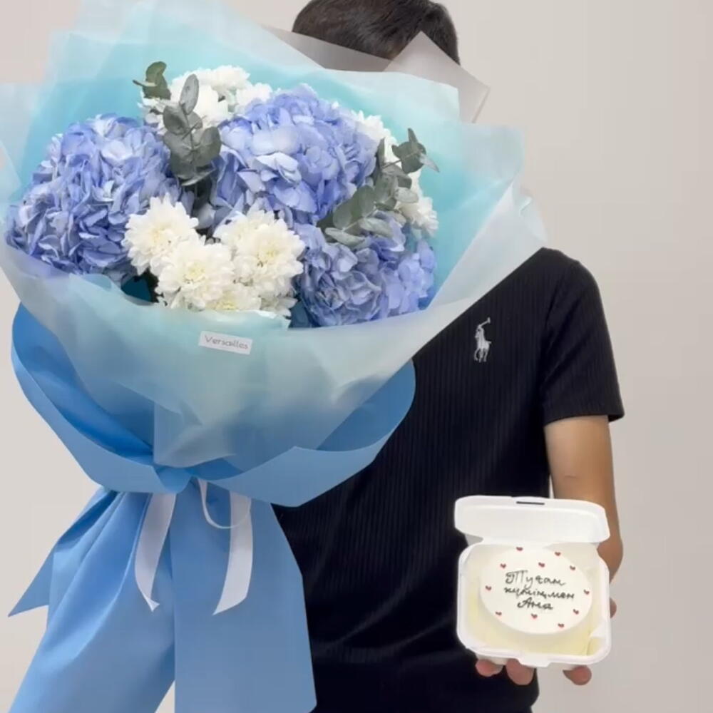 Гортензия - 3 шт. Хризантема кустовая - 3 шт. Эвкалипт - 3 шт. бенто торт (молочная девочка) - 1 шт.
