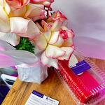 Французская роза - 3 шт. Фирменная упаковка - 1 шт. декоративная зелень эвкалипт - 3 шт. тортик красный бархат - 1 шт.