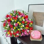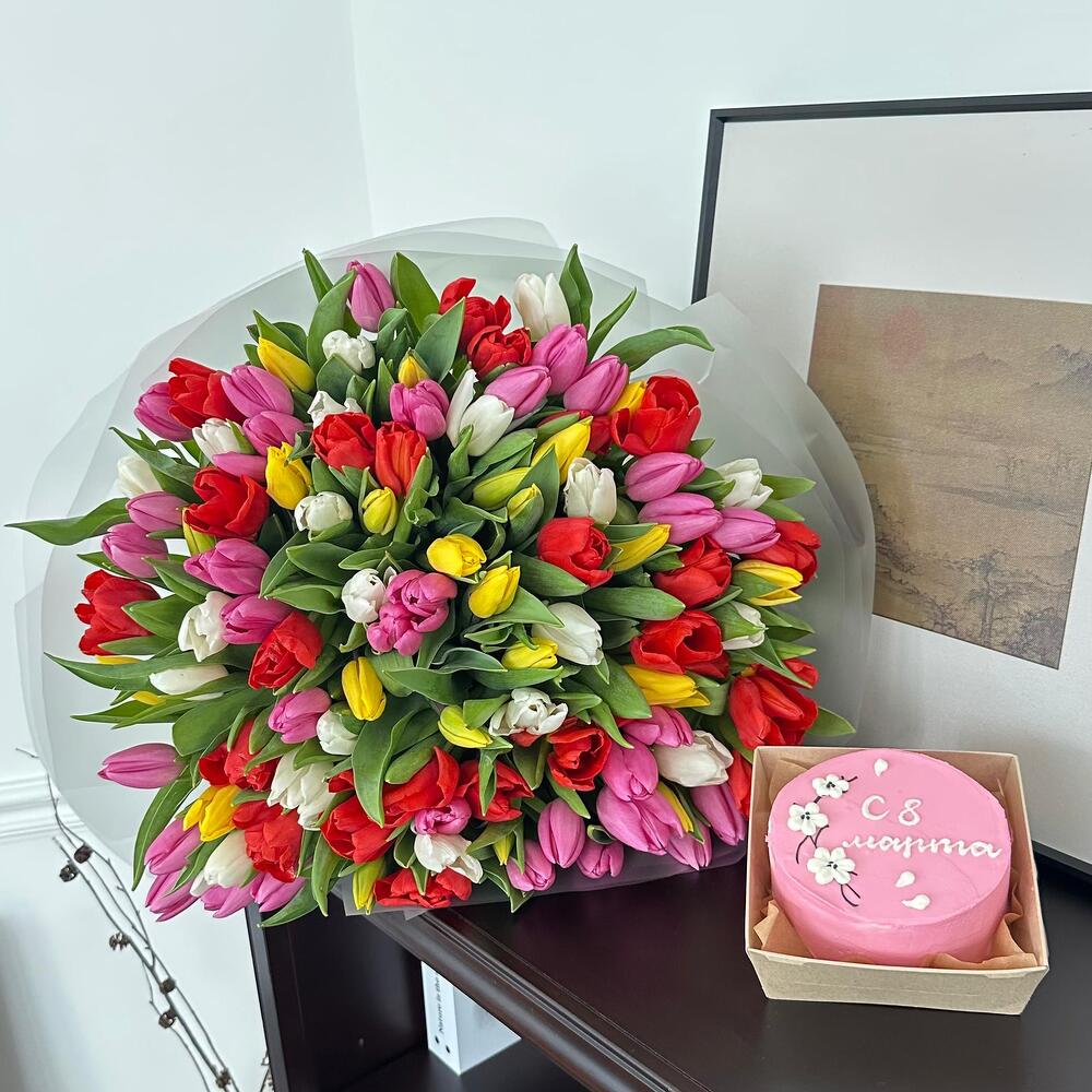 Комбо из 101 микс тюльпана и бенто тортика «С 8Марта»