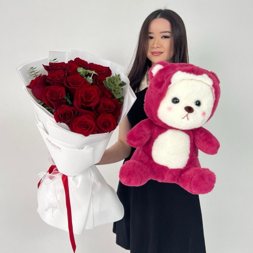 Букет красных роз + мягкий мишка 🧸❤️ Страсть и нежность в одном подарке: яркие розы выражают чувства, а плюшевый мишка дарит тепло и улыбку. Идеальный вариант для романтики и особенного сюрприза.