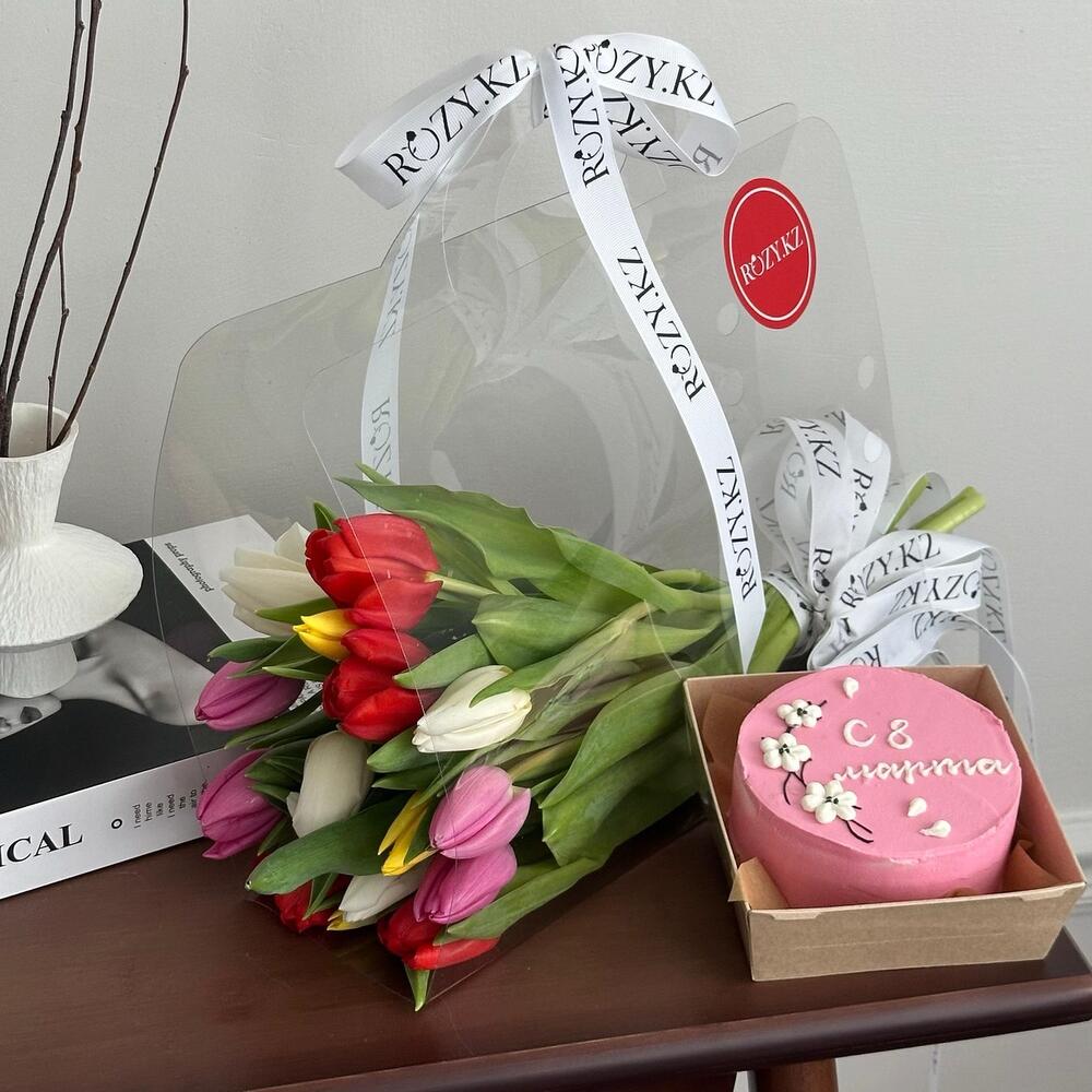 Комбо переноска из 15 тюльпанов и бенто тортика «С 8Марта»