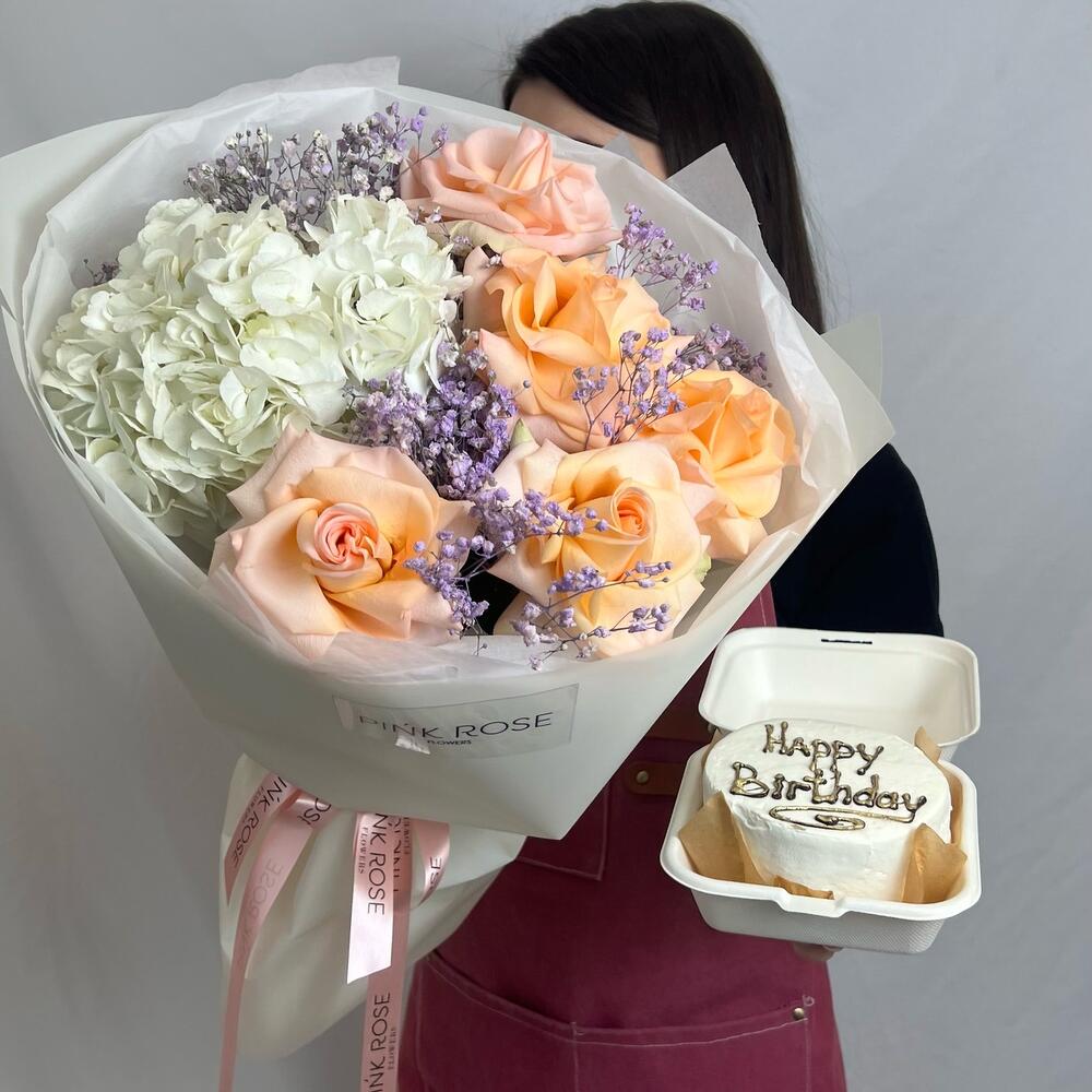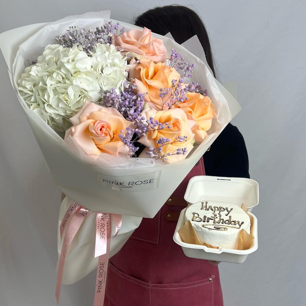 Гипсофила - 2 шт. Гортензия - 1 шт. Роза - 5 шт. бенто торт - 1 шт.