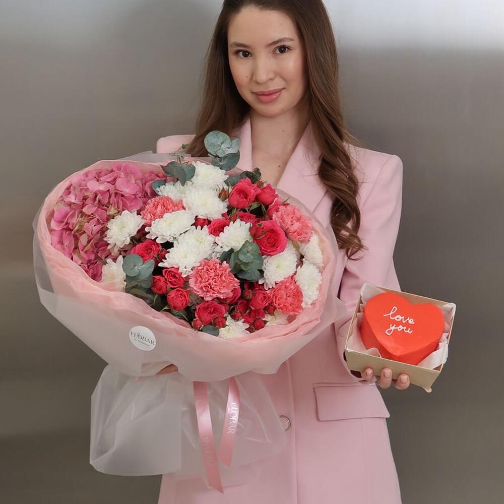 Гермини - 1 шт. Хризантема кустовая - 4 шт. Кустовая роза - 4 шт. Диантус - 5 шт. Эвкалипт Цинерея - 1 шт. гортензия королевская - 1 шт. бенто торт - 1 шт.