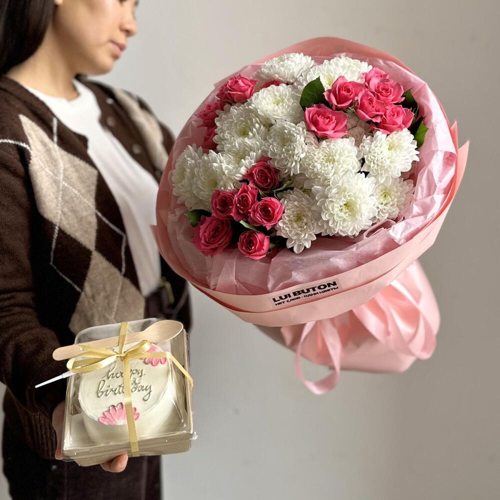 Цветы радуют глаз, тортик дарят сладость — вместе они создают атмосферу праздника и уюта. Универсальный подарок для особенных моментов