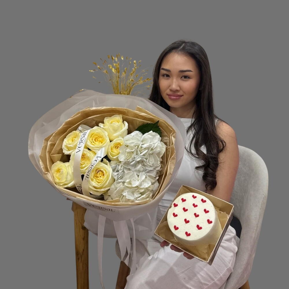 Комбо из жёлтых пионовидных роз, гортензии и бенто-торта — это радость, тепло и забота в одном подарке. Жёлтые розы символизируют счастье и позитивные эмоции, гортензия добавляет объёма и нежности, а бенто-торт делает сюрприз особенно запоминающимся. Идеальный вариант для создания праздничного настроения. Такой подарок радует сразу несколько чувств и отлично подойдёт для Дня всех влюблённых.