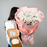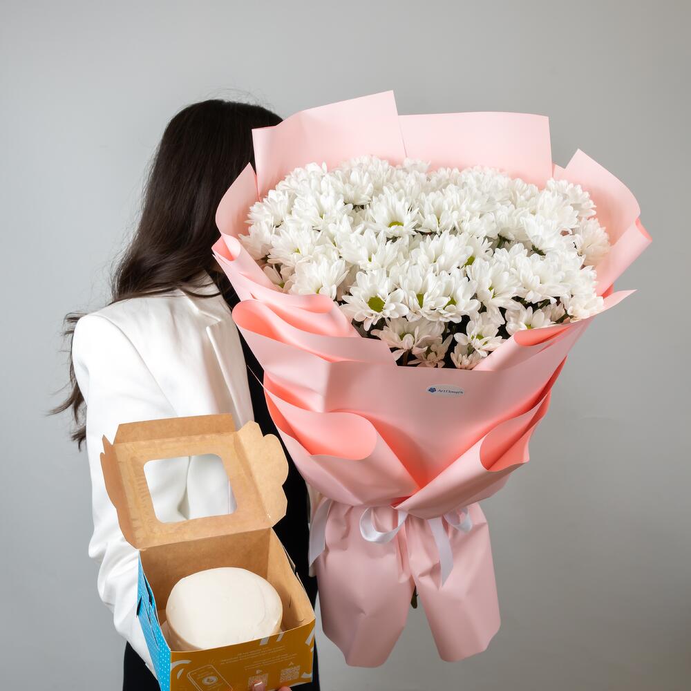 Нежный букет из 15 кустовых хризантем в нежном оформлении и сладкий бенто торт поднимет настроение. Цвет букета и оформление может меняться в зависимости от наличия.