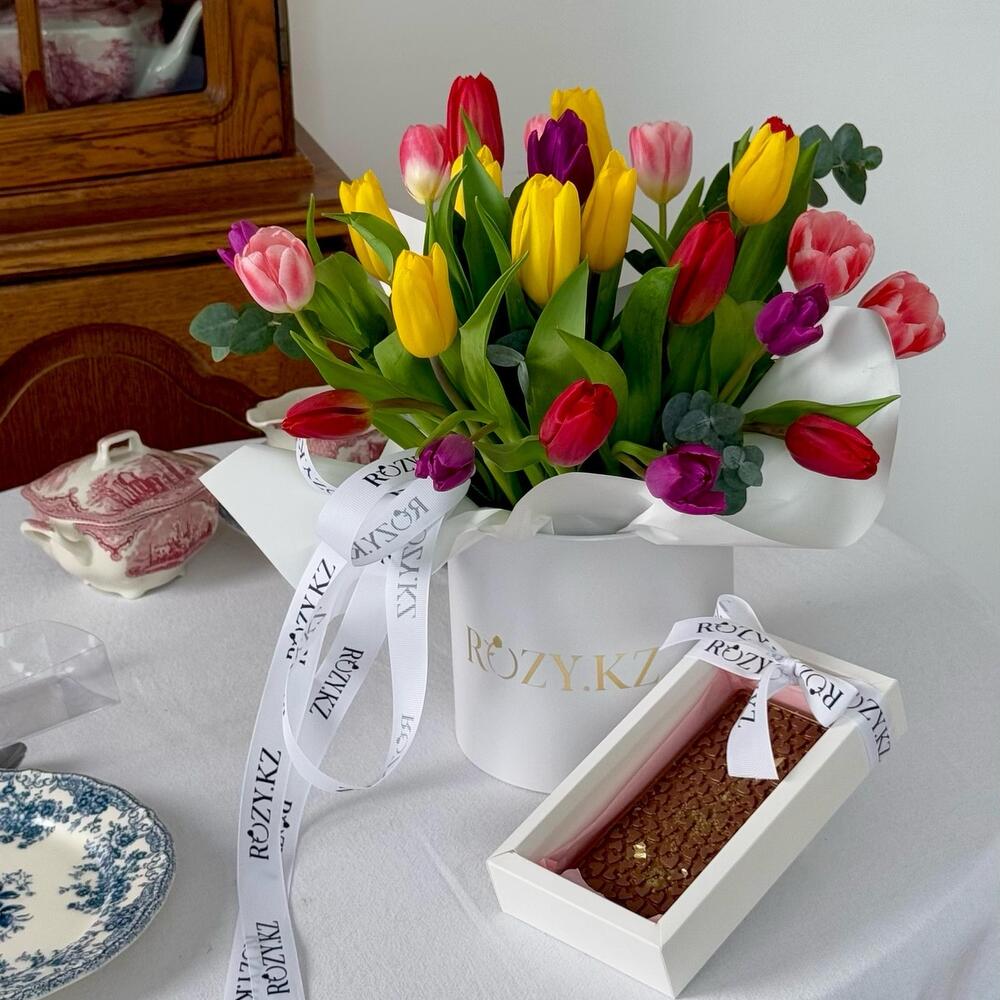 Тюльпан - 25 шт. Эвкалипт - 2 шт. Коробка шляпная - 1 шт. Упаковка дизайнерская - 1 шт. Оазис флористический - 1 шт. дубайский шоколад - 1 шт.