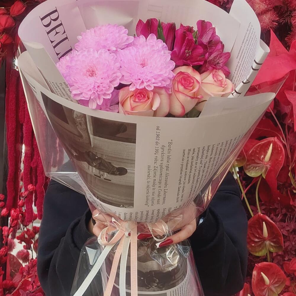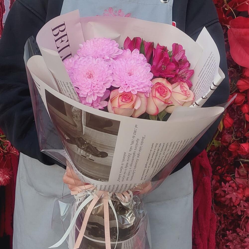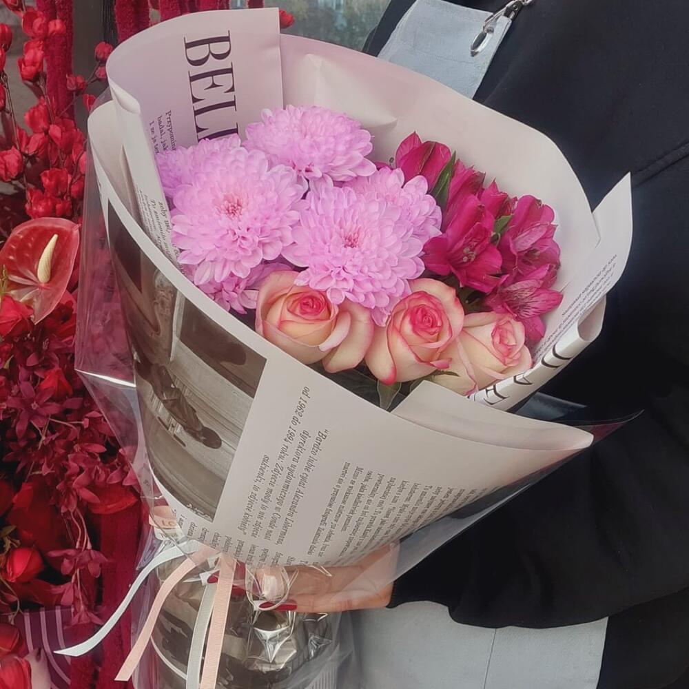 Альстромерия - 1 шт. Хризантема кустовая - 1 шт. розы - 3 шт.