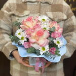 Альстромерия - 3 шт. Хризантема кустовая - 3 шт. Эвкалипт Цинерея - 4 шт. роза сорт контики - 3 шт.