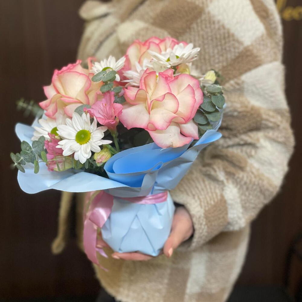 Альстромерия - 3 шт. Хризантема кустовая - 3 шт. Эвкалипт Цинерея - 4 шт. роза сорт контики - 3 шт.