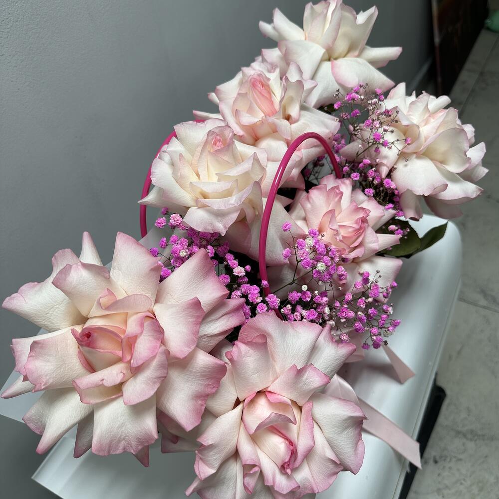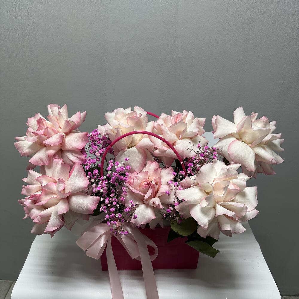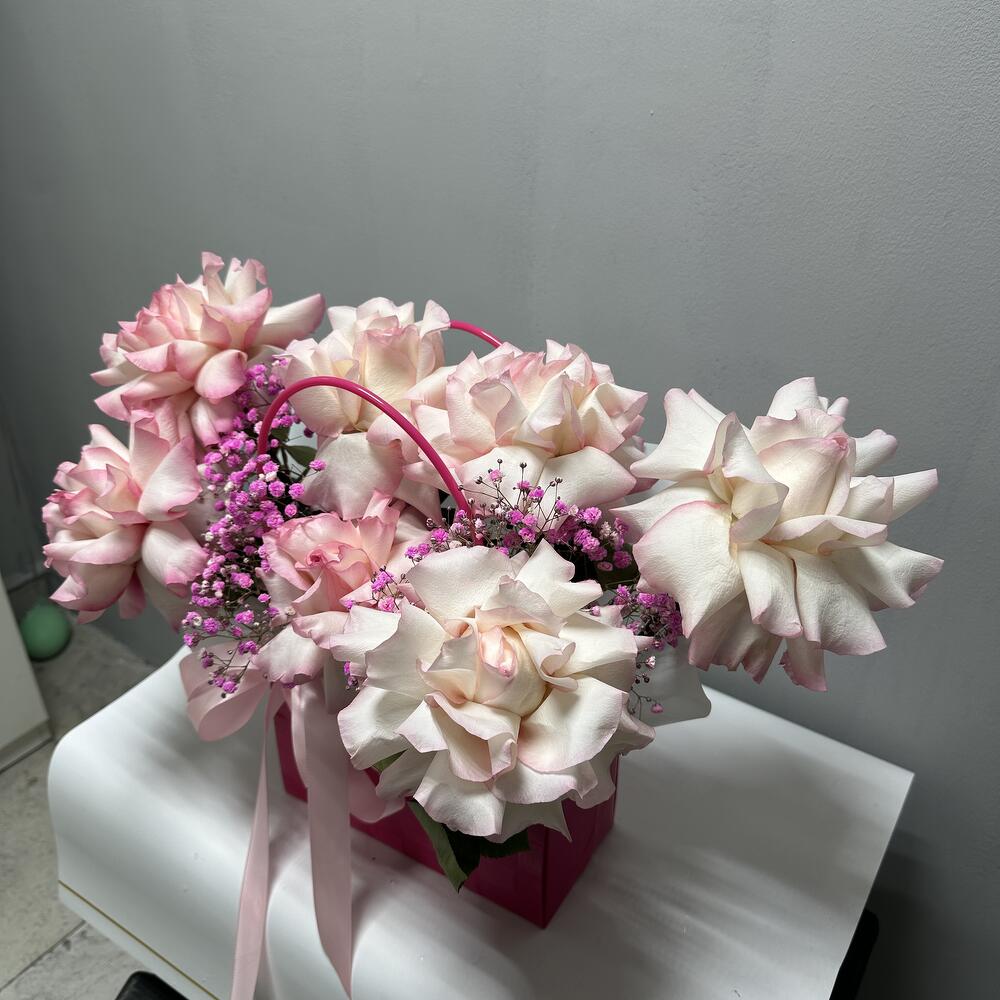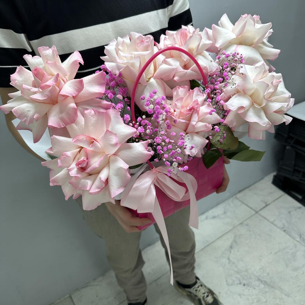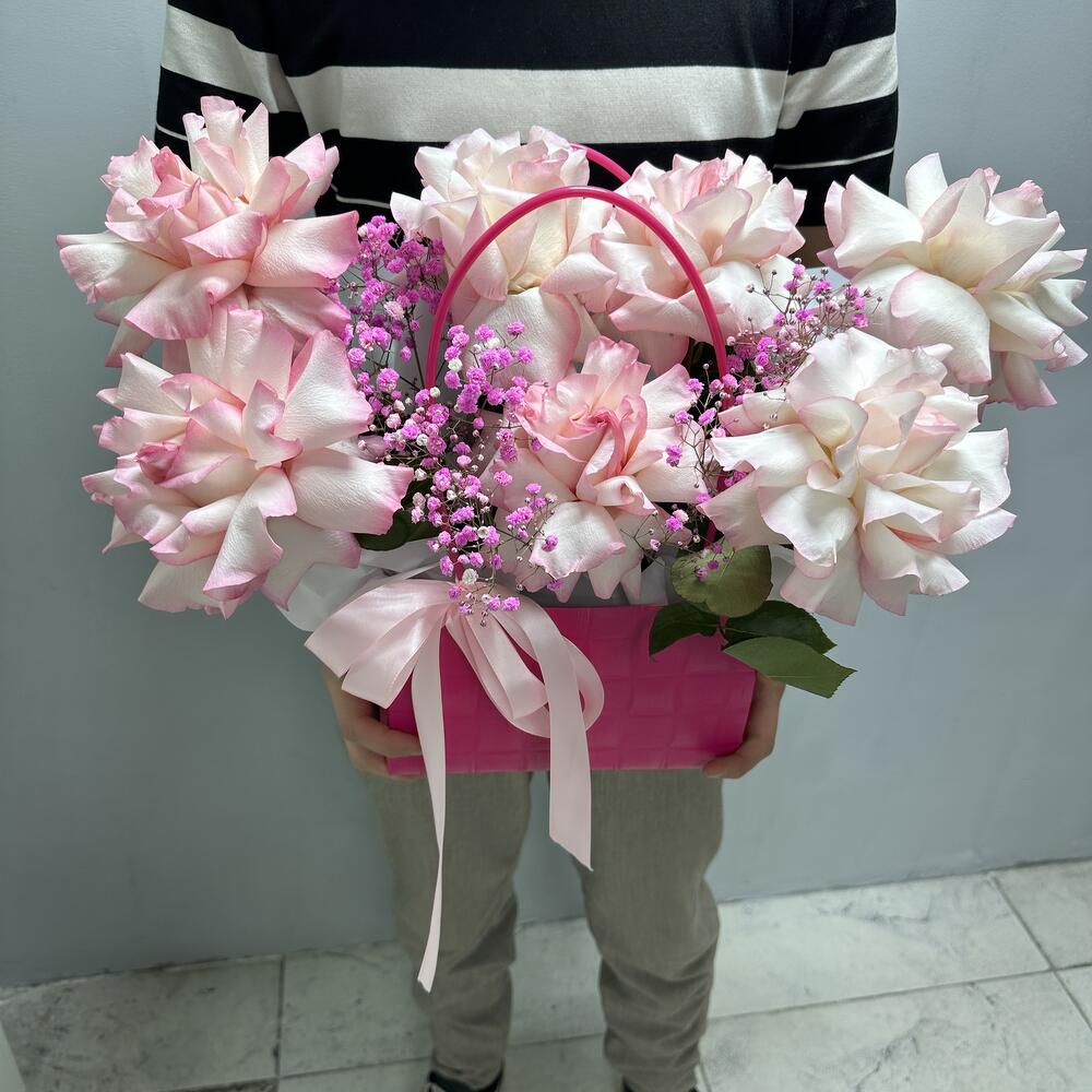 Гипсофила - 1 шт. Лента - 1 шт. Сумочка - 1 шт. Оазис флористический - 1 шт. аква бумага - 1 шт. розы boulevard - 7 шт.