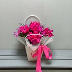 Букет “Яркий акцент” 💖🌸 Этот букет — как вспышка эмоций в сером буднем дне! ⚡ Пять малиновых роз 🌹🌹🌹🌹🌹 с бархатистыми лепестками создают эффектную основу, подчёркнутую нежной фиолетовой гипсофилой ✨, словно россыпь звёзд на вечернем небе. Свежесть и легкость добавляет зелень фисташки 🌿, создавая гармоничный контраст. Композиция собрана на флористической губке 🧽, чтобы цветы дольше радовали своей красотой. Аква-бумага в стильную белую полоску 📄 и элегантная белая сумочка 🛍 делают букет современным и аккуратным, а ярко-розовая репсовая лента 🎀 — финальный штрих, добавляющий изысканности. Подарите взрыв цвета и настроения 🌈 — букет, который говорит без слов! 💐