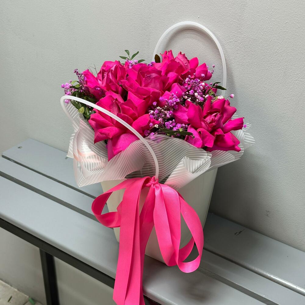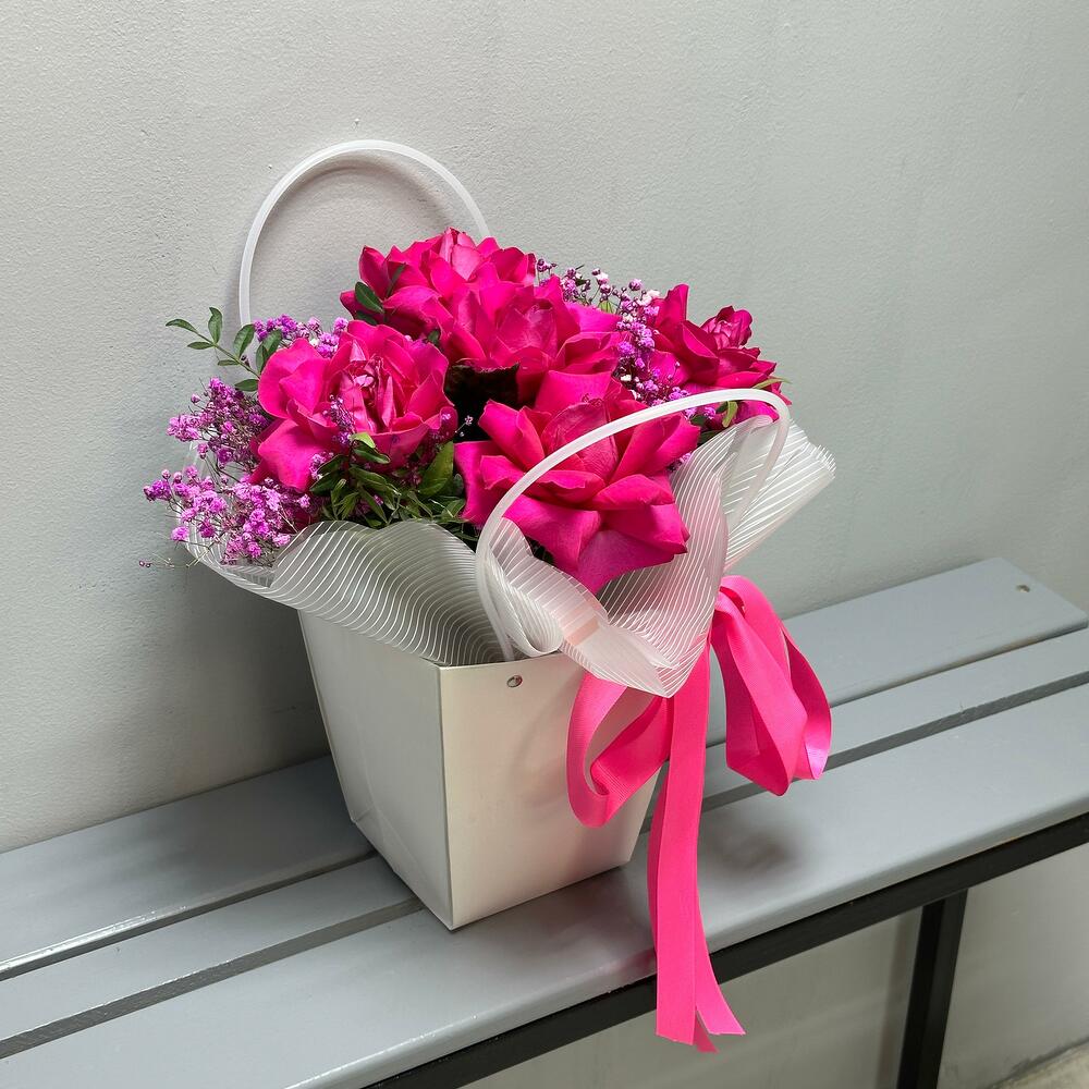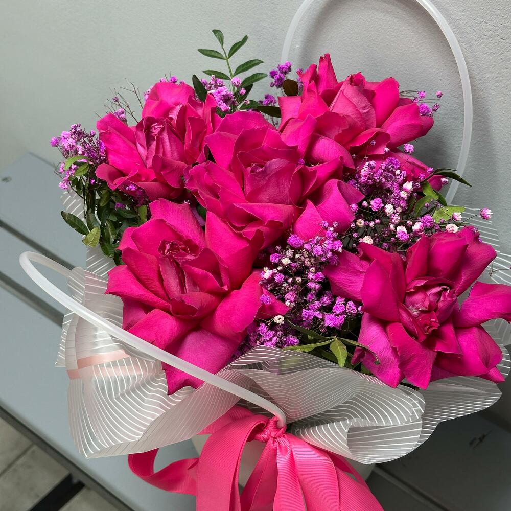 Букет “Яркий акцент” 💖🌸 Этот букет — как вспышка эмоций в сером буднем дне! ⚡ Пять малиновых роз 🌹🌹🌹🌹🌹 с бархатистыми лепестками создают эффектную основу, подчёркнутую нежной фиолетовой гипсофилой ✨, словно россыпь звёзд на вечернем небе. Свежесть и легкость добавляет зелень фисташки 🌿, создавая гармоничный контраст. Композиция собрана на флористической губке 🧽, чтобы цветы дольше радовали своей красотой. Аква-бумага в стильную белую полоску 📄 и элегантная белая сумочка 🛍 делают букет современным и аккуратным, а ярко-розовая репсовая лента 🎀 — финальный штрих, добавляющий изысканности. Подарите взрыв цвета и настроения 🌈 — букет, который говорит без слов! 💐