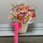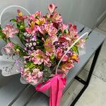 Композиция «Лёгкое очарование» 💜🎀 Нежность и элегантность в стильном формате! 8 розовых альстромерий 🌸 символизируют искренность и тёплые чувства, а воздушная гипсофила 💜 добавляет композиции невесомости и романтичности. Свежесть эвкалипта «Бэби-Блю» 🌿 придаёт букету естественную гармонию. Цветы закреплены во флористической губке, что сохраняет их свежими и живыми дольше. Белая сумочка с оформлением в аква-бумаге в полоску 🎁 делает композицию стильной и оригинальной. Этот букет — идеальный вариант для лёгкого, но эффектного подарка, который запомнится! ✨💕