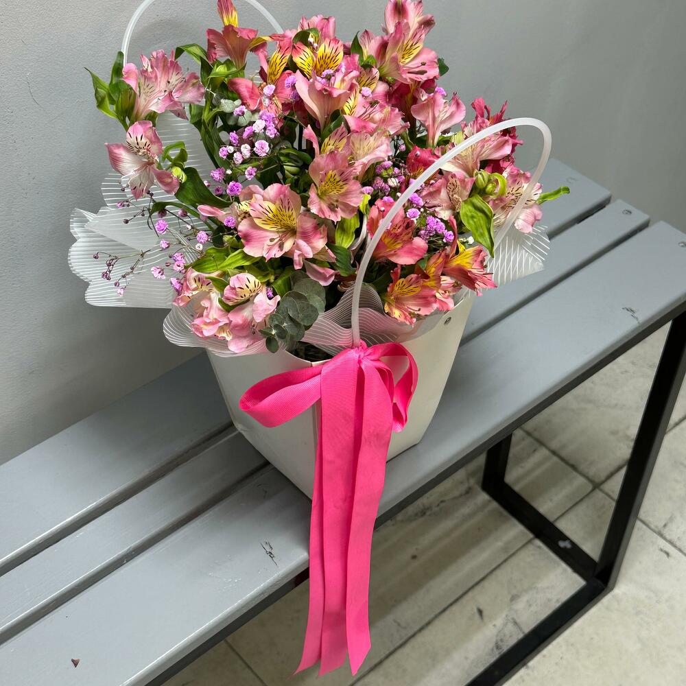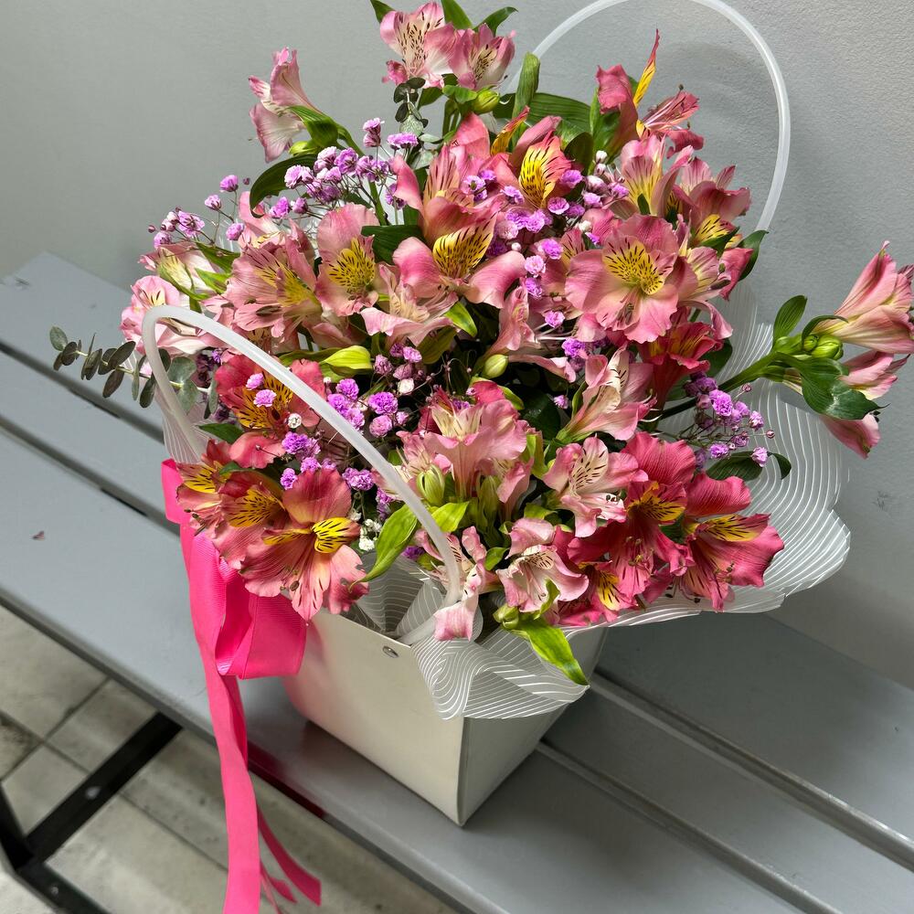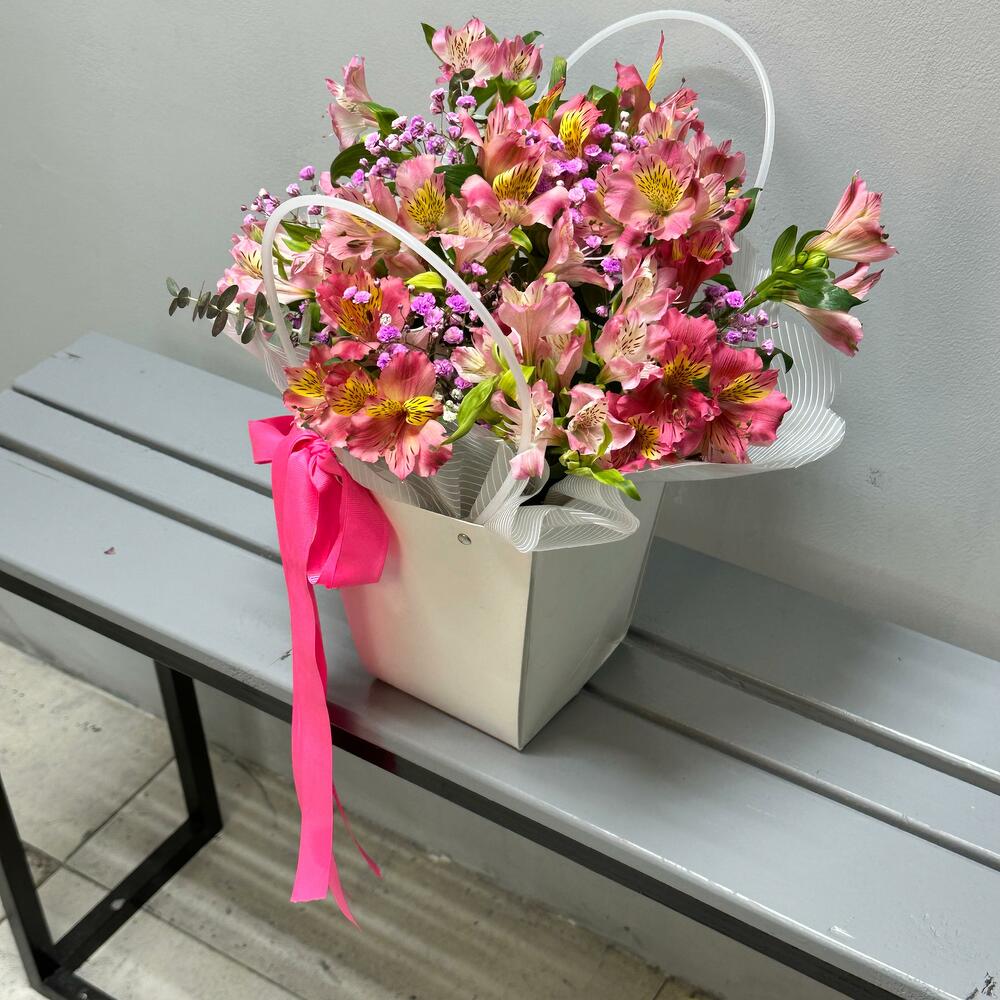 Композиция «Лёгкое очарование» 💜🎀 Нежность и элегантность в стильном формате! 8 розовых альстромерий 🌸 символизируют искренность и тёплые чувства, а воздушная гипсофила 💜 добавляет композиции невесомости и романтичности. Свежесть эвкалипта «Бэби-Блю» 🌿 придаёт букету естественную гармонию. Цветы закреплены во флористической губке, что сохраняет их свежими и живыми дольше. Белая сумочка с оформлением в аква-бумаге в полоску 🎁 делает композицию стильной и оригинальной. Этот букет — идеальный вариант для лёгкого, но эффектного подарка, который запомнится! ✨💕