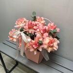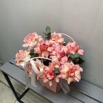 Композиция «Розовый шарм» 🌸🎀 Элегантное сочетание 9 нежно-розовых роз и свежего эвкалипта создаёт атмосферу утончённости и лёгкости. 💕✨ Композиция оформлена в стильную нежно-розовую сумочку, что делает её не только красивым, но и удобным подарком. Благодаря флористической губке, цветы сохраняют свежесть и радуют получателя как можно дольше. 🌿💖 💐 Идеальный выбор для тех, кому хочется подарить немного нежности и тепла! 💞