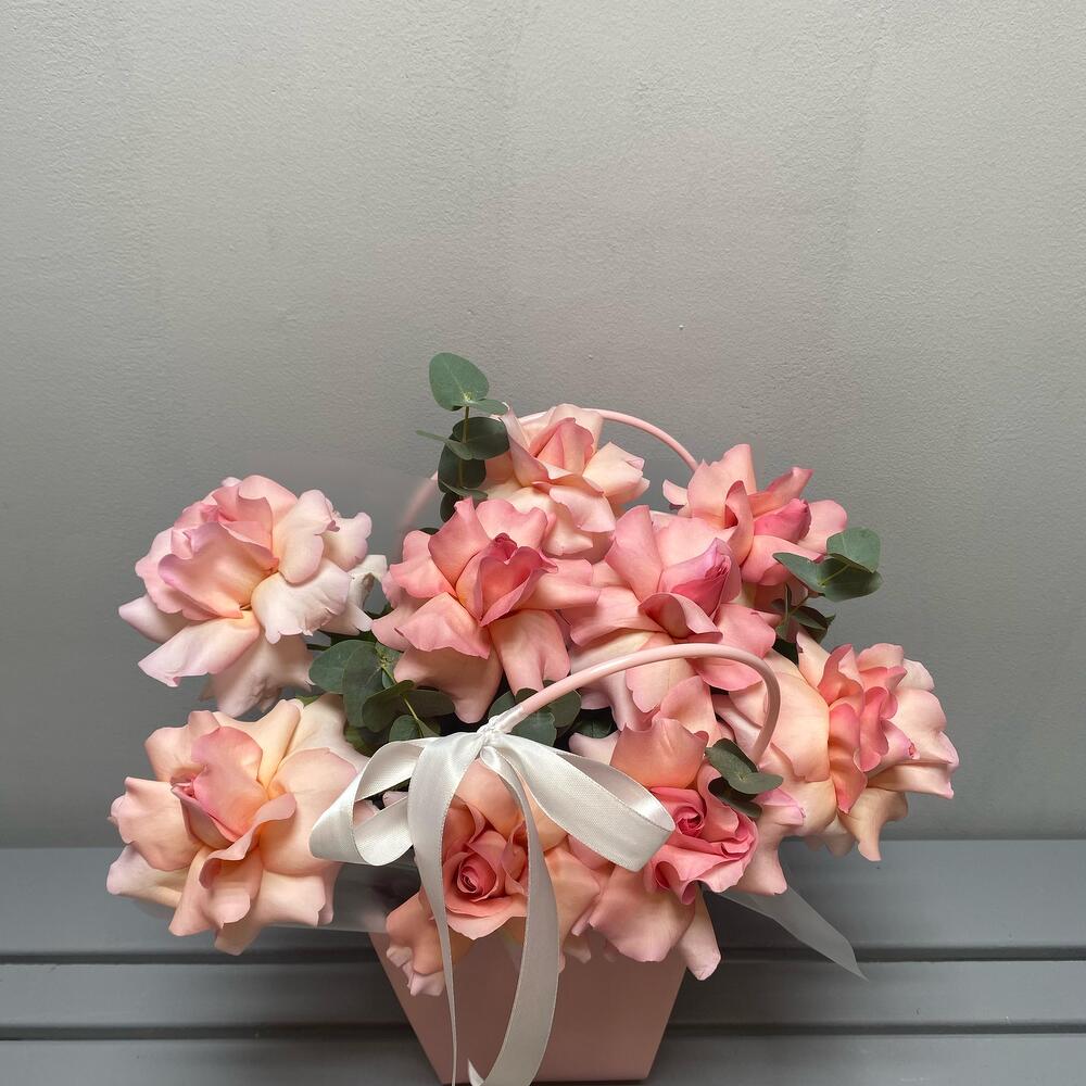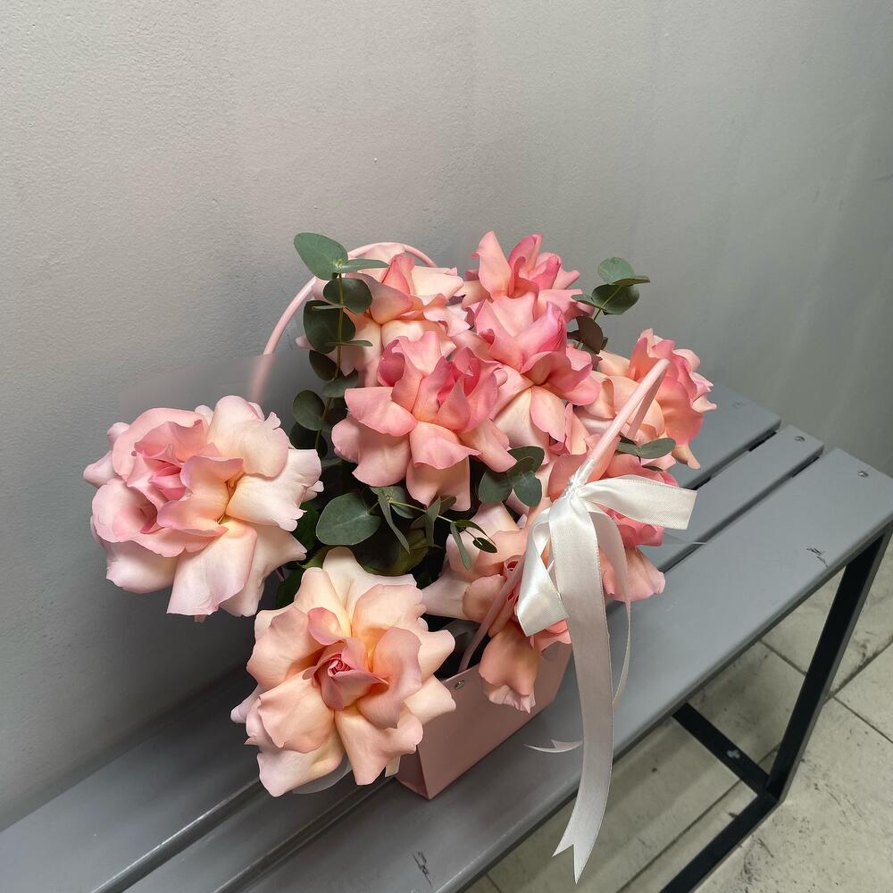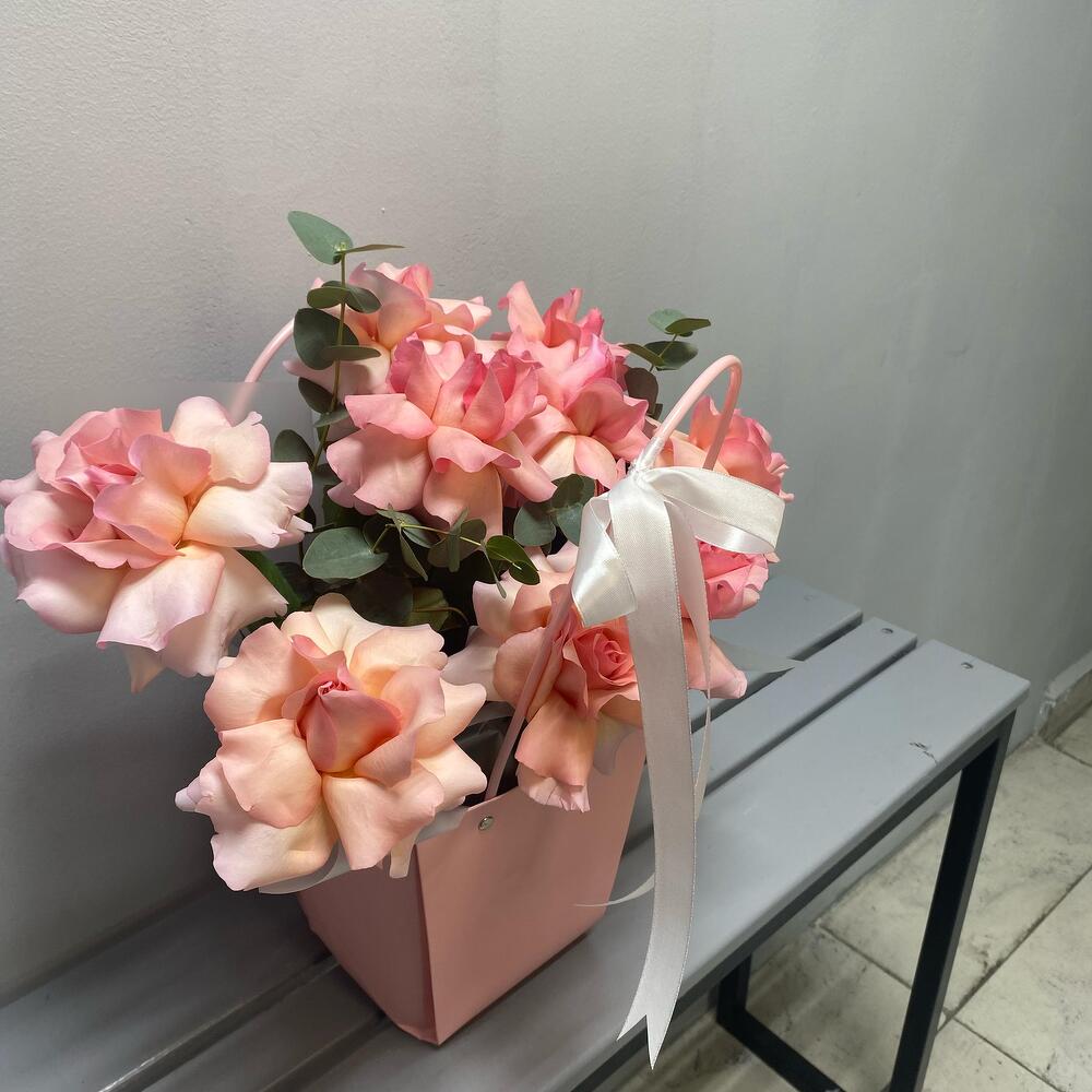 Композиция «Розовый шарм» 🌸🎀 Элегантное сочетание 9 нежно-розовых роз и свежего эвкалипта создаёт атмосферу утончённости и лёгкости. 💕✨ Композиция оформлена в стильную нежно-розовую сумочку, что делает её не только красивым, но и удобным подарком. Благодаря флористической губке, цветы сохраняют свежесть и радуют получателя как можно дольше. 🌿💖 💐 Идеальный выбор для тех, кому хочется подарить немного нежности и тепла! 💞