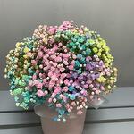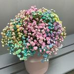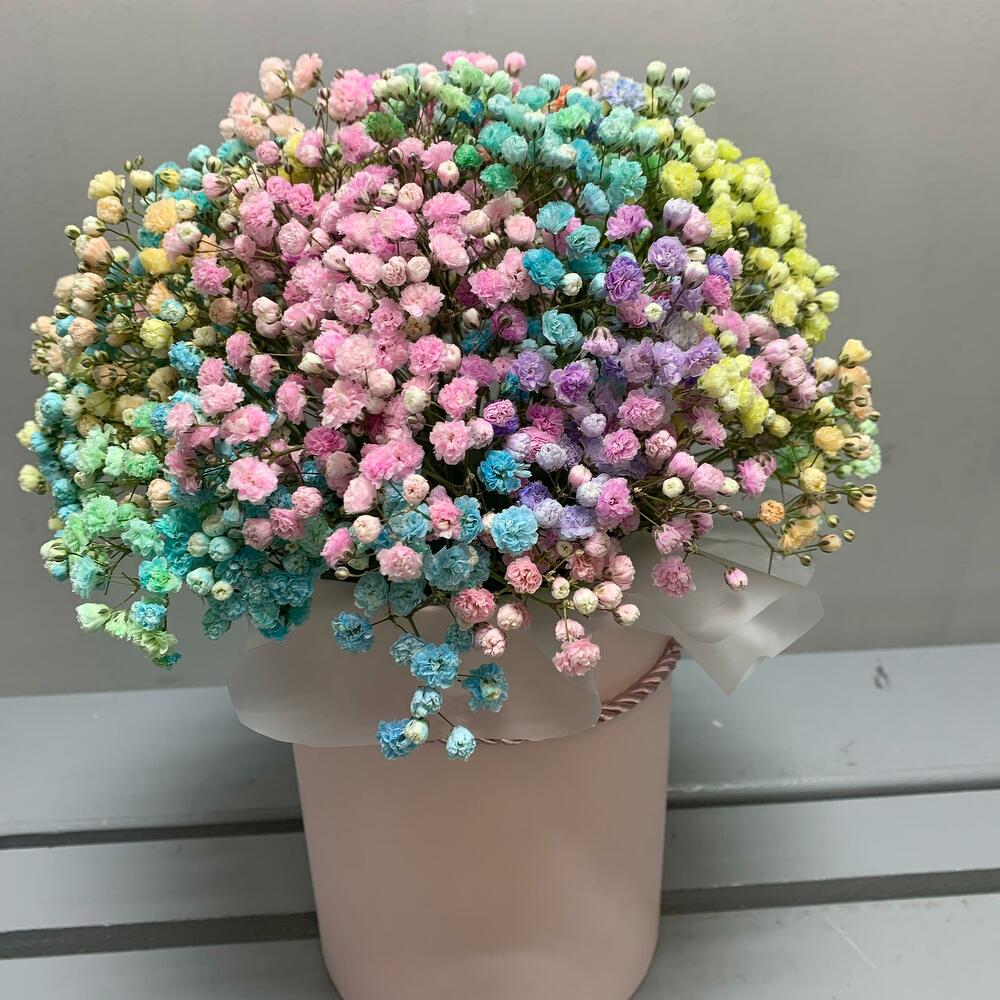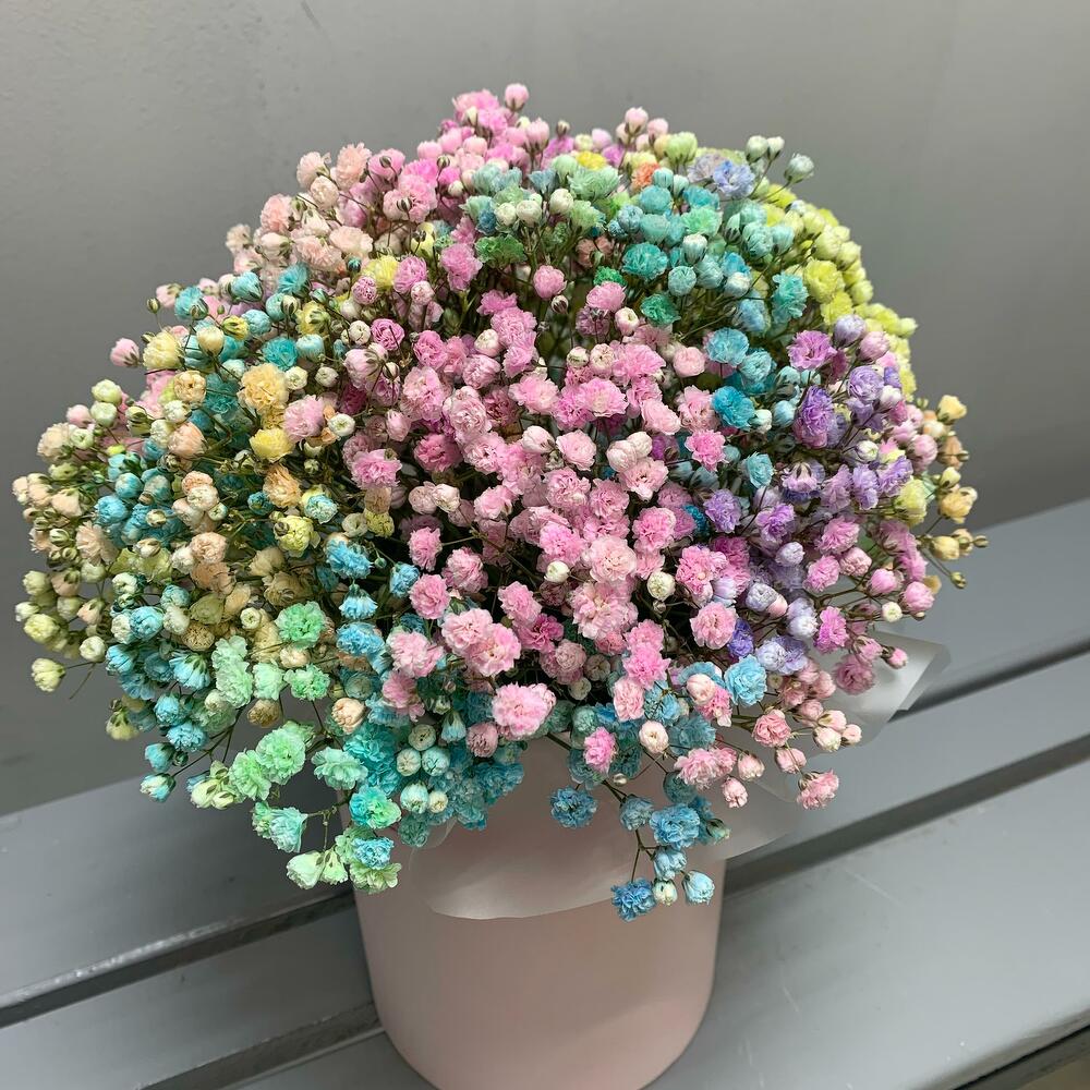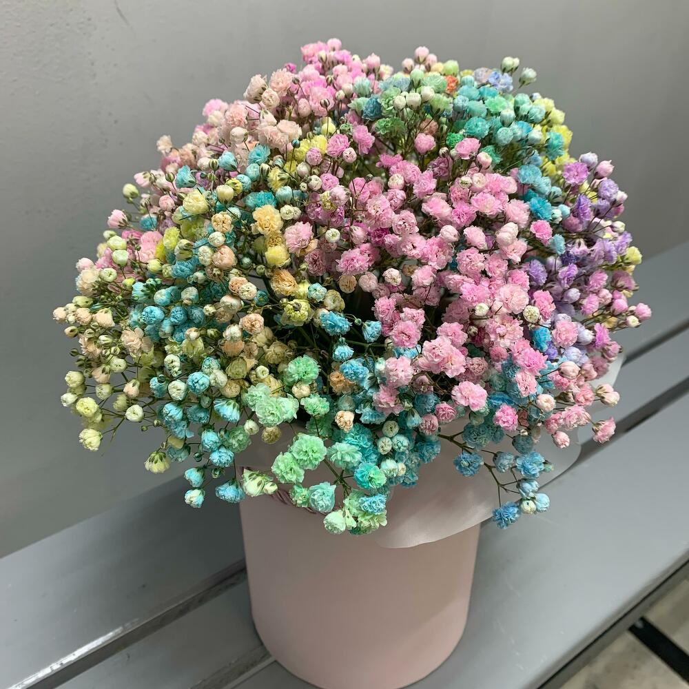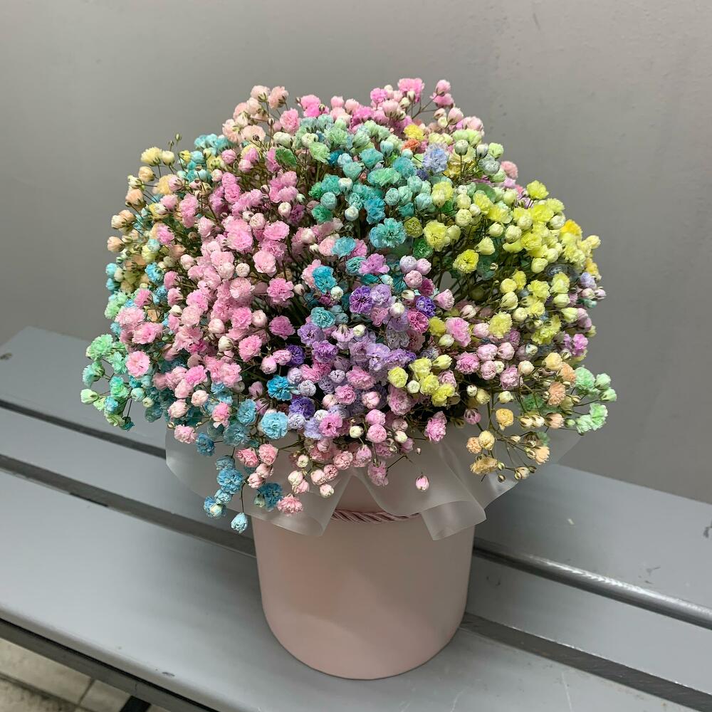 🌈 Радужное облако 🌈 Легкий, воздушный и волшебный — этот букет гипсофилы похож на пушистое облачко, окрашенное в нежные цвета радуги! ✨ Две веточки цветной гипсофилы создают эффект невесомости, а полупрозрачная матовая аква-бумага добавляет элегантности. Нежно-розовая коробка делает композицию еще более утонченной, а флористическая губка сохраняет свежесть надолго. 💖 Идеальный подарок для мечтателей, творческих душ и тех, кто верит в чудеса! 💖