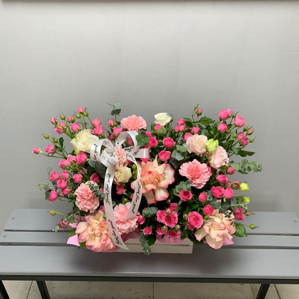 Лизиантус - 2 шт. Эвкалипт - 1 шт. Гвоздика розовая - 4 шт. Роза розовая - 3 шт. Роза кустовая розовая - 6 шт. Деревянный ящик - 1 шт. Флористическая губка - 1 шт. лента репсовая белая - 1 шт. аква бумага розовая - 1 шт.