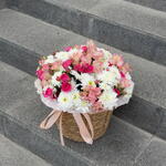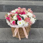 Альстромерия - 7 шт. Хризантема кустовая - 3 шт. Кашпо - 1 шт. Роза кустовая розовая - 2 шт. Флористическая губка - 1 шт. бумага тишью нежно-розовая - 2 шт. лента репсовая бежевая - 1 шт.