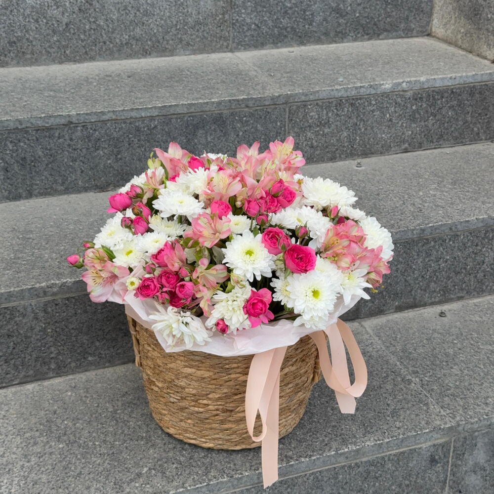 Альстромерия - 7 шт. Хризантема кустовая - 3 шт. Кашпо - 1 шт. Роза кустовая розовая - 2 шт. Флористическая губка - 1 шт. бумага тишью нежно-розовая - 2 шт. лента репсовая бежевая - 1 шт.