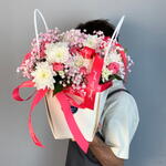 Роза кустовая розовая - 2 шт. Хризантема кустовая Белая - 3 шт. Флористическая губка - 1 шт. Гипсофила розовая - 2 шт. сумочка белая - 1 шт. лента репсовая розовая - 1 шт.