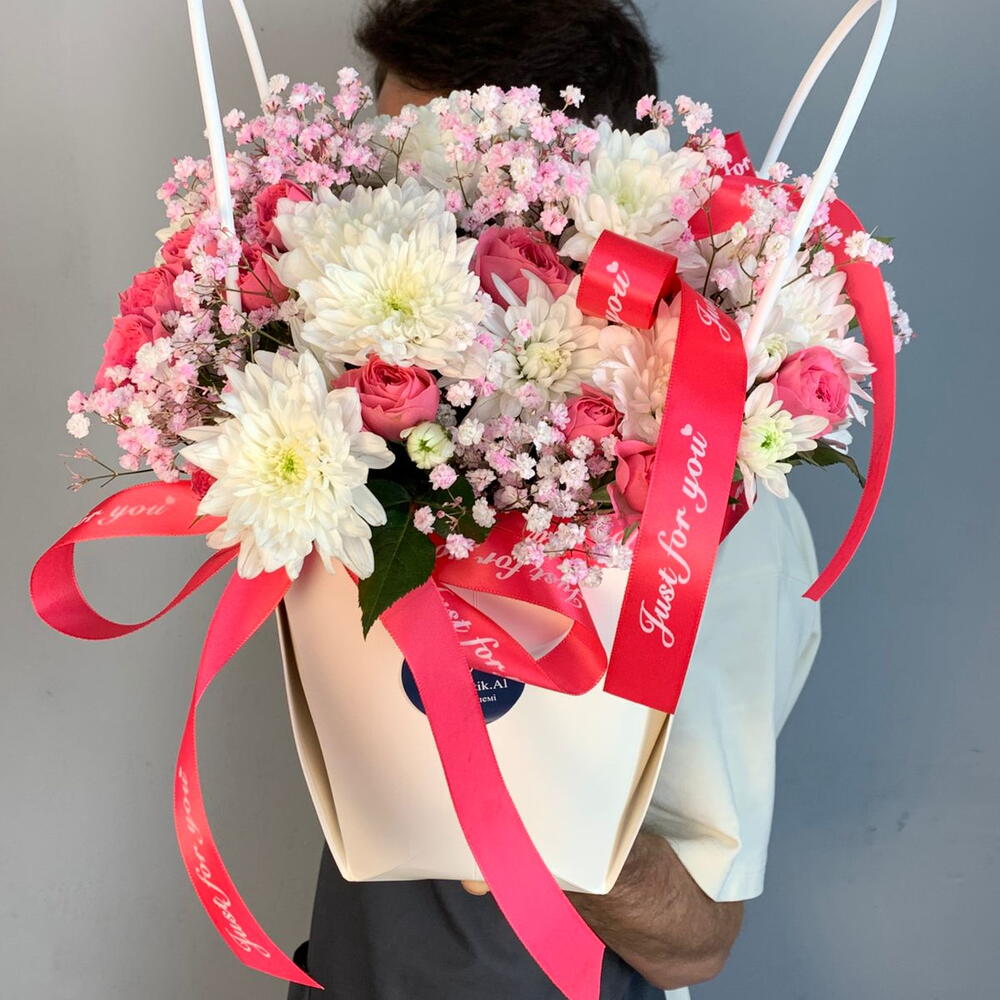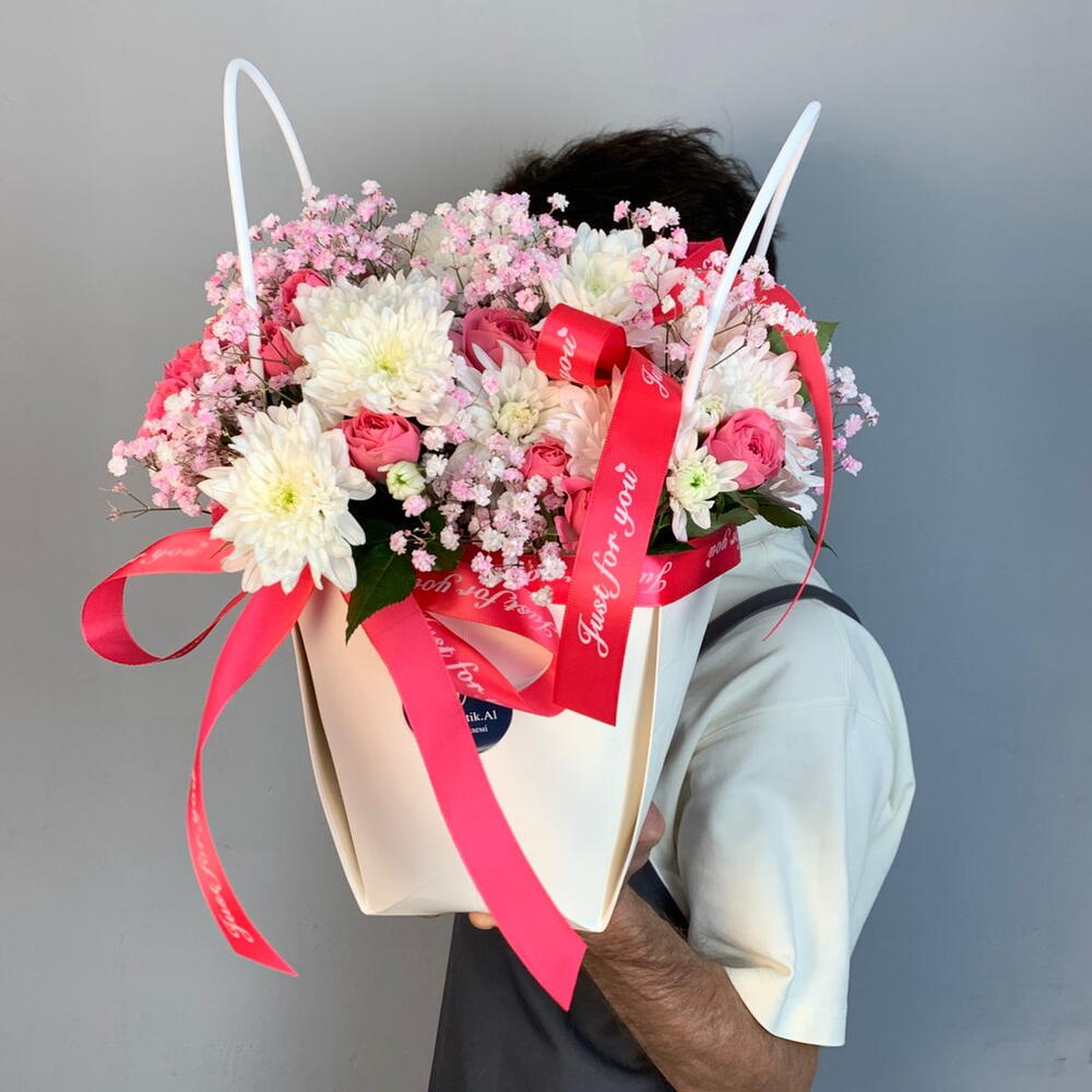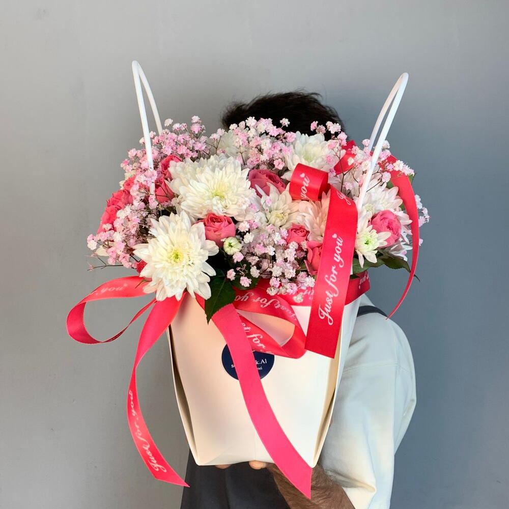 👜 «Милый акцент» 💗 Цветочная сумочка «Милый акцент» — это стильный комплимент, который вызывает улыбку с первого взгляда. 🤍 3 белые кустовые хризантемы — чистота и лёгкость 🌸 2 розовые кустовые розы — трогательная нежность ✨ 2 веточки розовой гипсофилы — будто розовое облачко 👜 Упаковано в элегантную белую сумочку с флористической губкой 🎀 Завершено розовой лентой для акцента Подарите это маленькое чудо тем, кто делает вашу жизнь мягче и светлее 💕 Идеально для подруги, мамы, коллеги или первой влюблённости.
