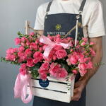 🌸 «Розовый Шёпот» 🌸 Миниатюрный, но невероятно трогательный букет из 6 кустовых роз нежно-розового оттенка 💗, дополненный свежим эвкалиптом бэби блю 🌿, который наполняет композицию лёгким ароматом и ноткой свежести. В стильном деревянном ящике 📦 и с нежно-розовыми лентами 🎀 — этот букет словно создан, чтобы сказать «я думаю о тебе» 💞. 💐 Идеальный подарок для милых моментов и тёплых признаний.