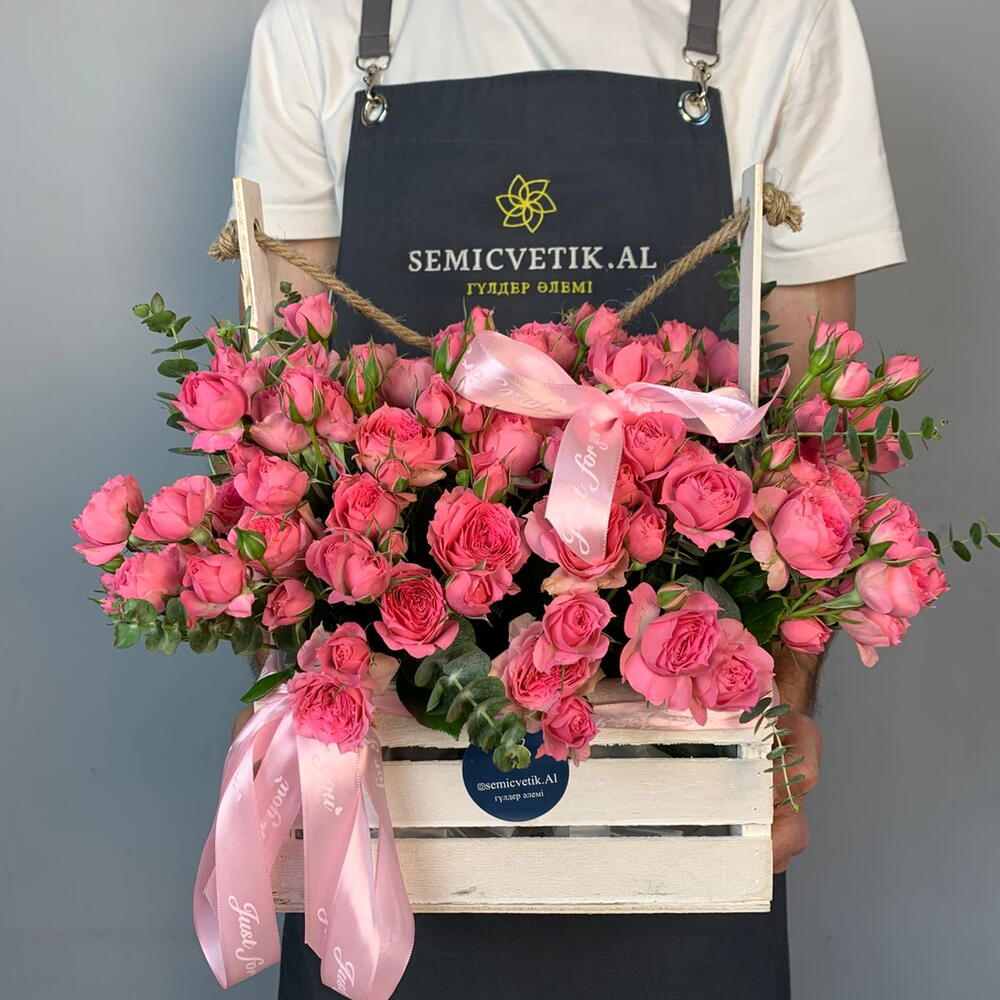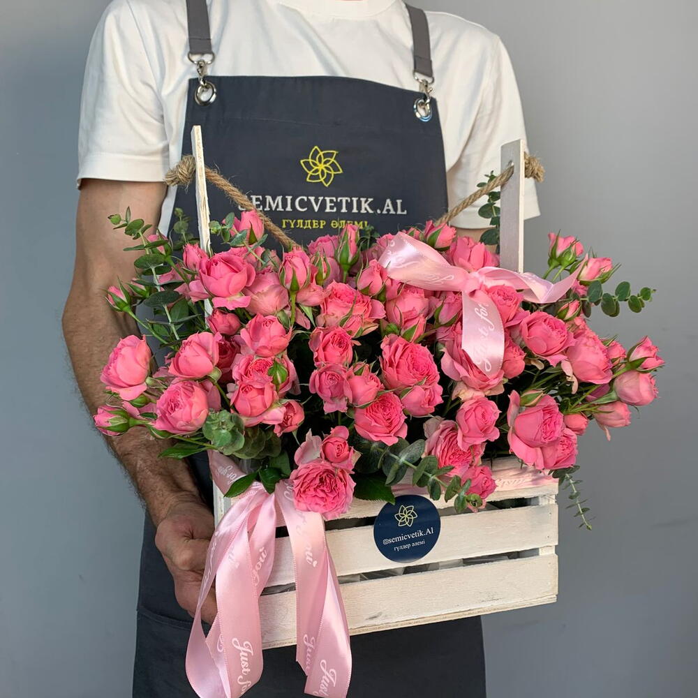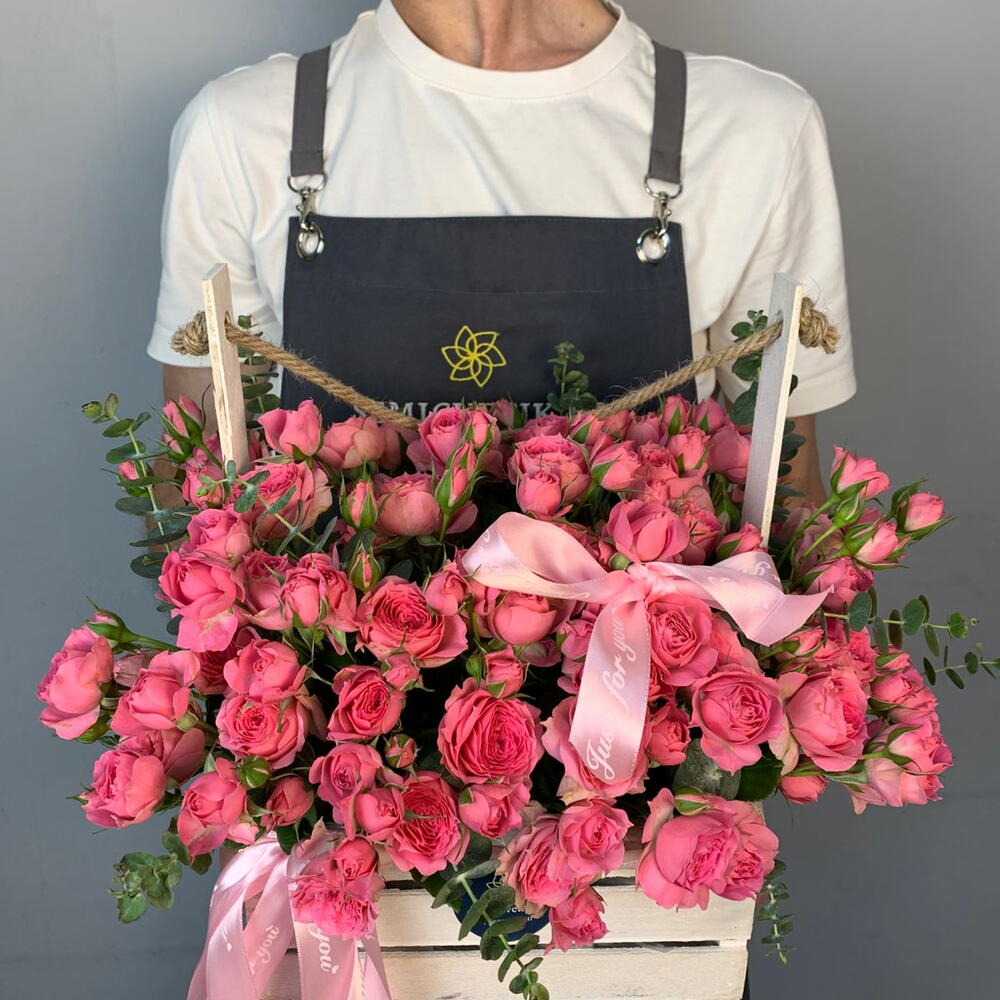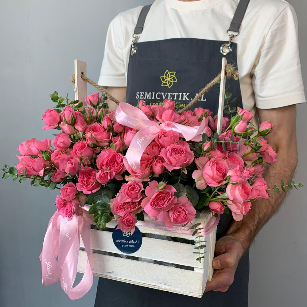 Роза кустовая розовая - 6 шт. Флористическая губка - 2 шт. Ящик - 1 шт. Эвкалипт Baby Blue - 1 шт. лента репсовая нежно-розовая - 2 шт.