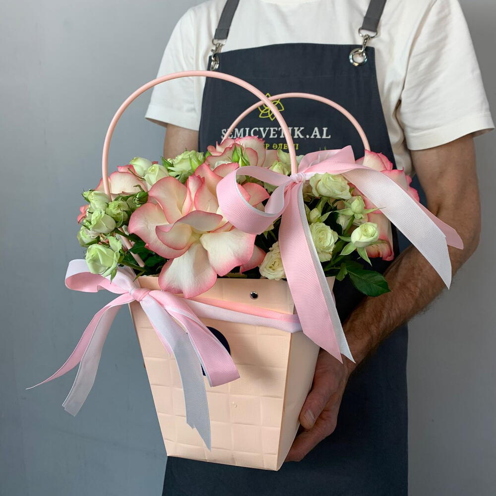 Роза розовая - 5 шт. Роза кустовая белая - 4 шт. Флористическая губка - 2 шт. лента репсовая нежно-розовая и белая - 2 шт. сумочка нежно-розовая - 1 шт.