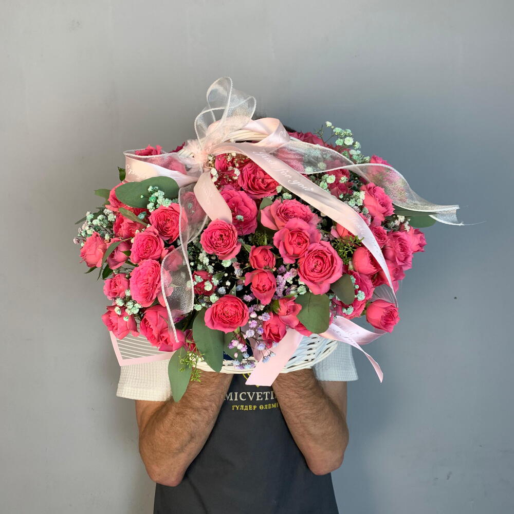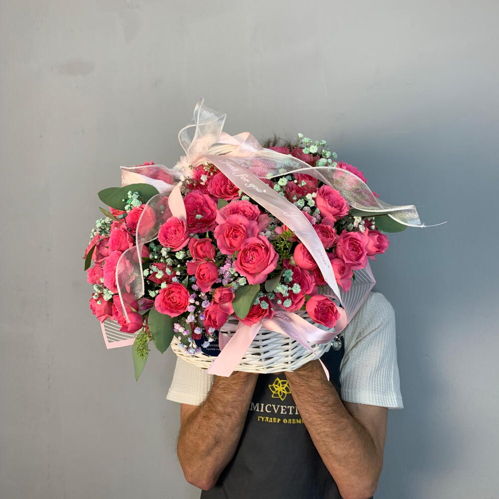 💐 Корзина «Дыхание нежности» 💐 🌷 5 кустовых роз розового оттенка – символ утончённости и любви ✨ 2 облака гипсофилы – лёгкость и мечтательность 🌿 1 веточка эвкалипта – свежесть и гармония 🤍 Белая корзина с нежно-розовой лентой – стильное оформление, которое превращает букет в изысканный подарок Этот цветочный дуэт романтики и свежести дарит ощущение лёгкости и счастья 🌸🎀. Идеален для поздравлений, тёплых признаний и просто «без повода» 💕