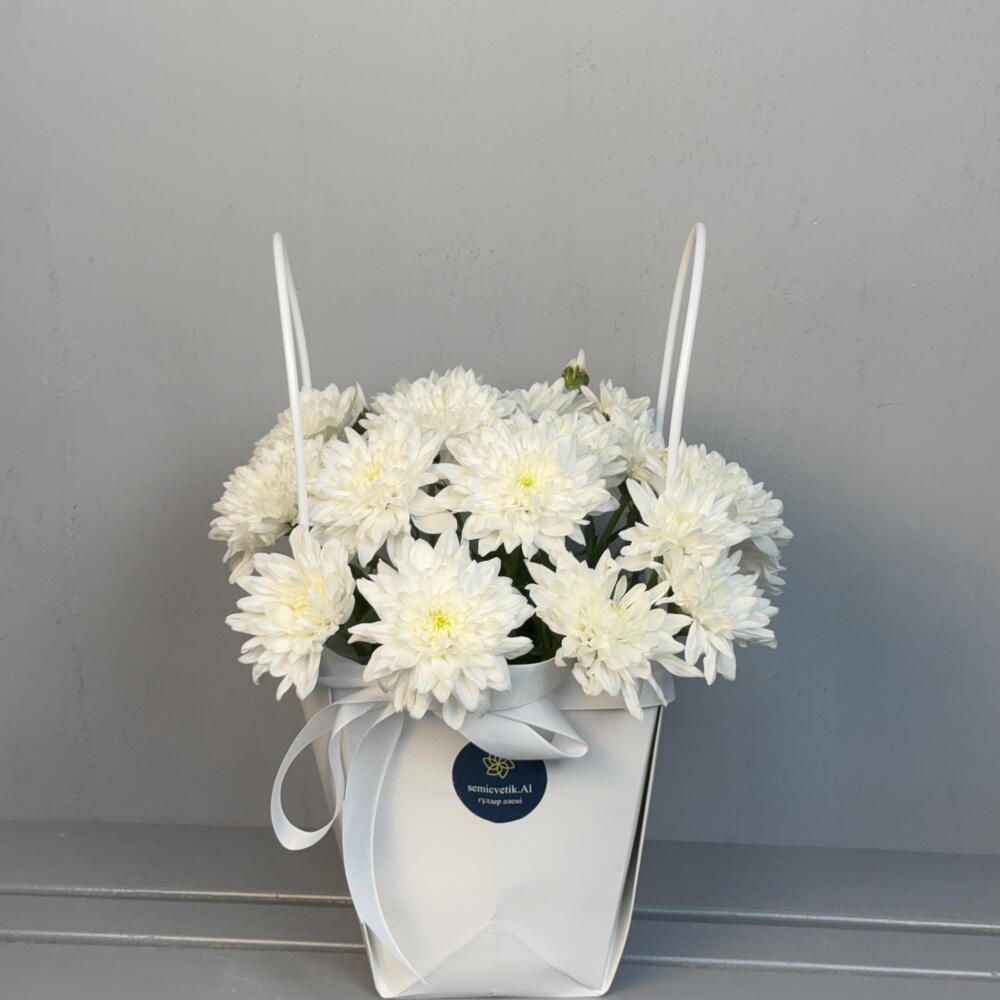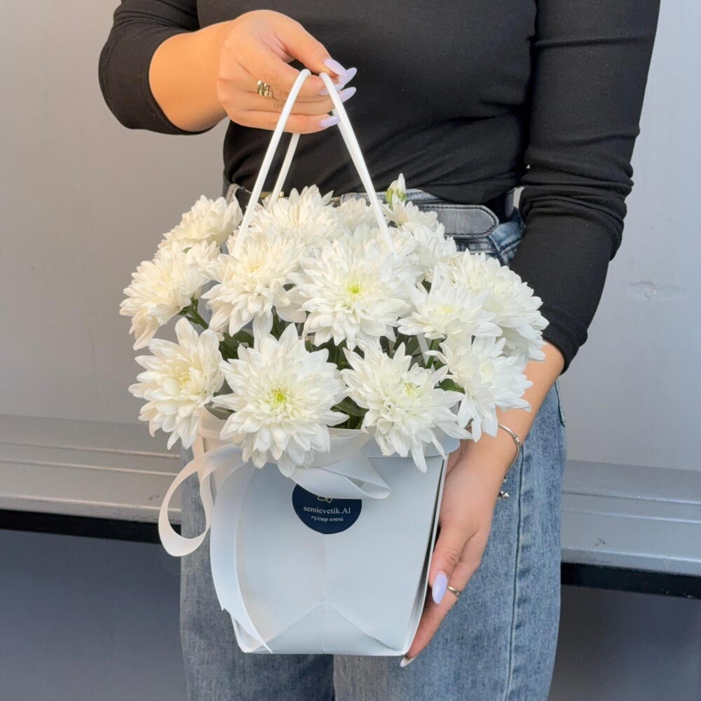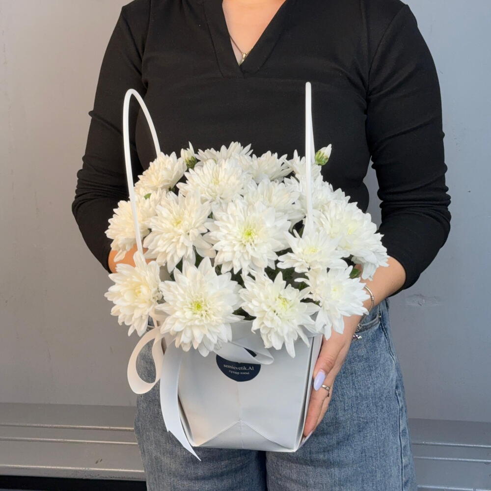 🤍 Букет-сумочка “Белая Легенда” 🤍 Четыре кустовые белые хризантемы 🌼 собраны в элегантную белую сумочку 👜. Лаконичный и нежный дизайн делает букет универсальным подарком — для радости, благодарности или приятного сюрприза ✨. Стильная простота, которая всегда уместна 💝