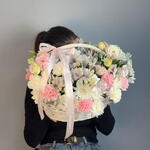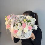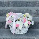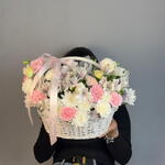 Альстромерия - 5 шт. Лизиантус - 4 шт. Гвоздика розовая - 4 шт. Хризантема кустовая Белая - 3 шт. Флористическая губка - 2 шт. Корзина белая - 1 шт. лента нежно-розовая - 1 шт.