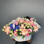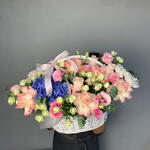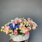 Композиция 183 «Розовое Утро» 🌸🤍✨ Изысканная композиция, в которой мягкие оттенки розовых роз соединяются с воздушным лизиантусом, белыми кустовыми хризантемами и ароматным эвкалиптом. Это настоящий глоток свежести и романтики — лёгкий, утончённый и идеально сбалансированный. Матовая полупрозрачная аква-бумага и нежно-розовая репсовая лента придают композиции премиальный вид, а белая корзина делает подарок не просто букетом, а стильным интерьерным акцентом. 🎁 Идеально для: любимой, мамы, сестры, коллеги — для нежных поздравлений, романтических моментов, дня рождения или просто чтобы подарить тепло. ✨ Композиция, которая создаёт настроение с первого взгляда.