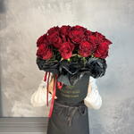 Роза красная - 21 шт. Флористическая губка - 2 шт. Коробка черная - 1 шт. бумага тишью черная - 2 шт. лента тонкая бордовая - 1 шт.