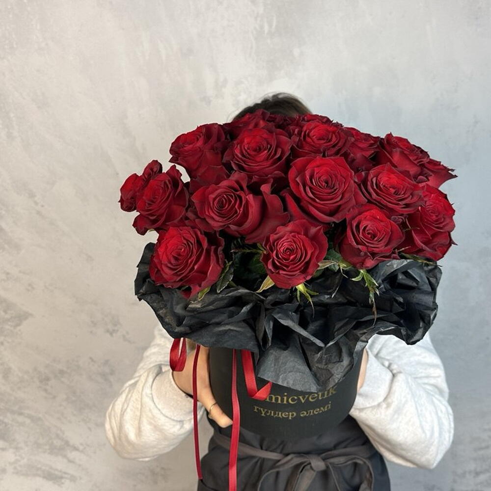 Роза красная - 21 шт. Флористическая губка - 2 шт. Коробка черная - 1 шт. бумага тишью черная - 2 шт. лента тонкая бордовая - 1 шт.